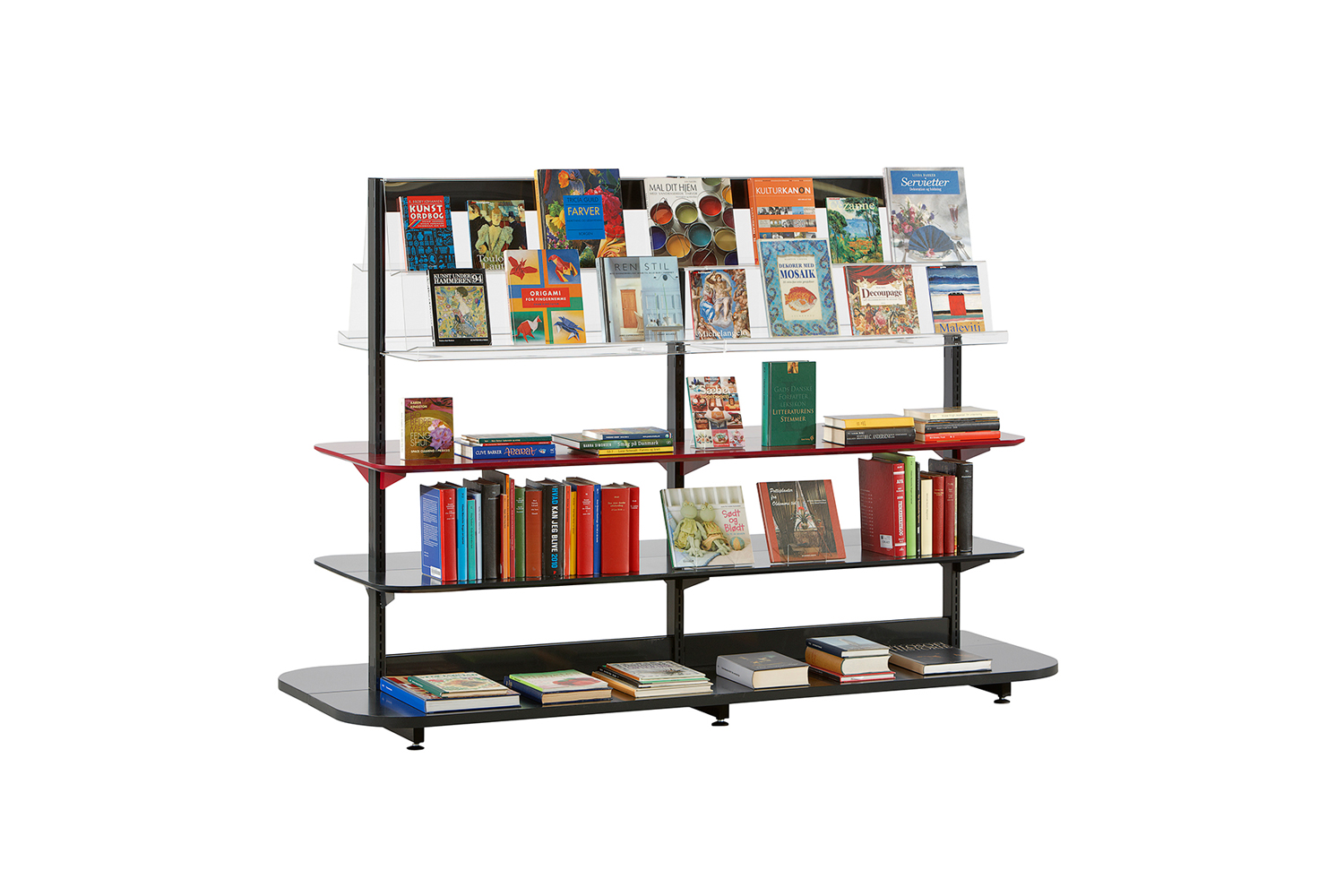 60/30 Expo est disponible en versions simple et double face, comme élément de base et complémentaire (maximum 3 éléments). Il se compose de montants métalliques, de tablettes en bois laquées et de tablettes de présentation en acrylique. Les montants métalliques et les tablettes en bois laquées sont disponibles dans tous nos coloris. Vous avez également le choix entre deux modèles de tablettes : à bords droits ou arrondis. De nombreuses configurations sont disponibles en standard, mais vous pouvez également composer un meuble de présentation sur mesure qui répond exactement aux exigences de votre bibliothèque.