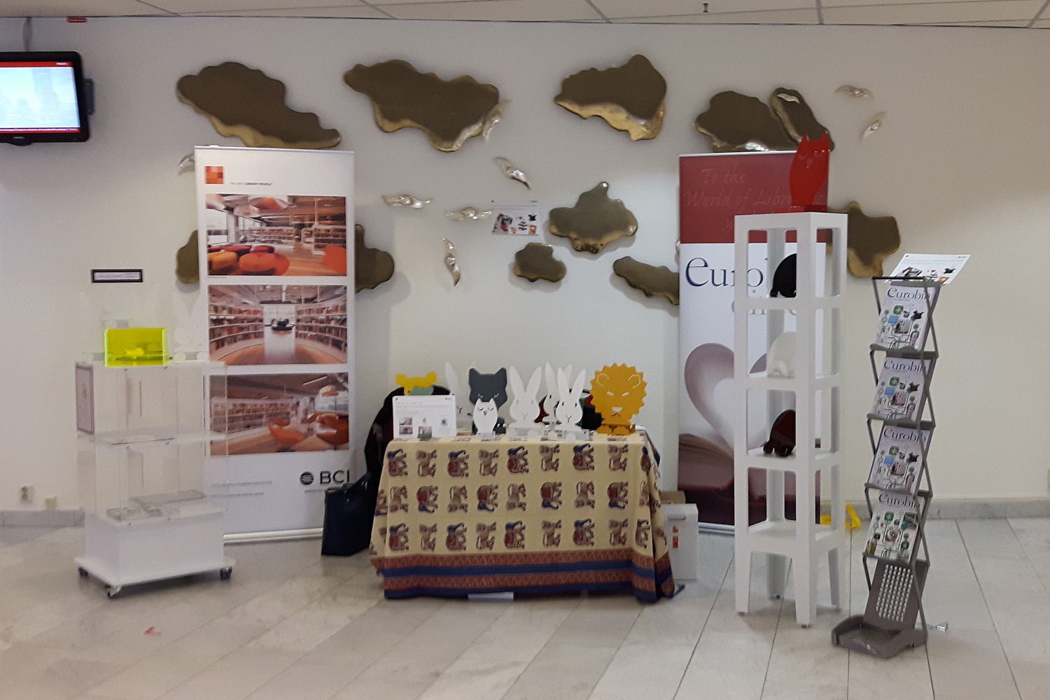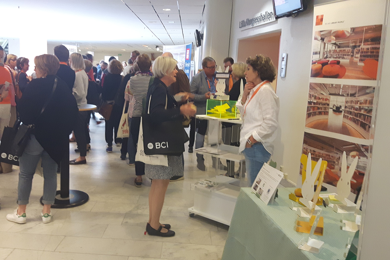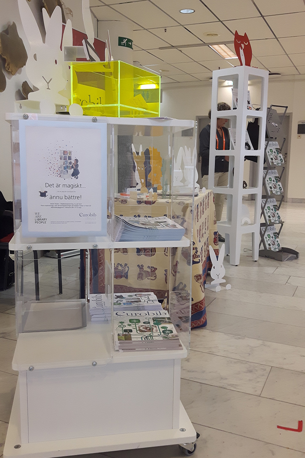 Les participants ont eu l’occasion de visiter un certain nombre de stands entre les séminaires. Le stand de Lammhults Biblioteksdesign AB a attiré les foules et a donné aux visiteurs la possibilité de découvrir d’intéressantes solutions de présentation pour bibliothèques, dont des meubles mais également des présentoirs. Un concours a été organisé dont les trois gagnants par jour ont remporté un présentoir Rabbit.