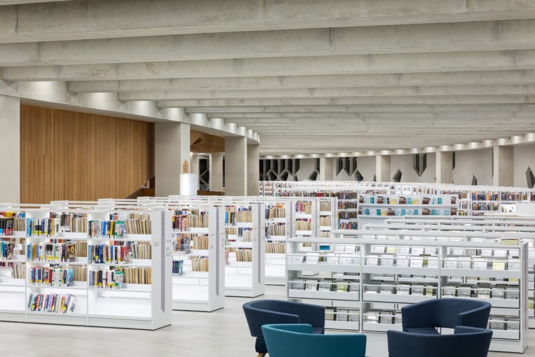 Nous sommes fiers d’avoir fourni notre système de rayonnages Slimline, adapté spécialement pour répondre aux exigences des architectes et de la bibliothèque. Chaque rayonnage individuel possède en outre un éclairage LED particulièrement discret.