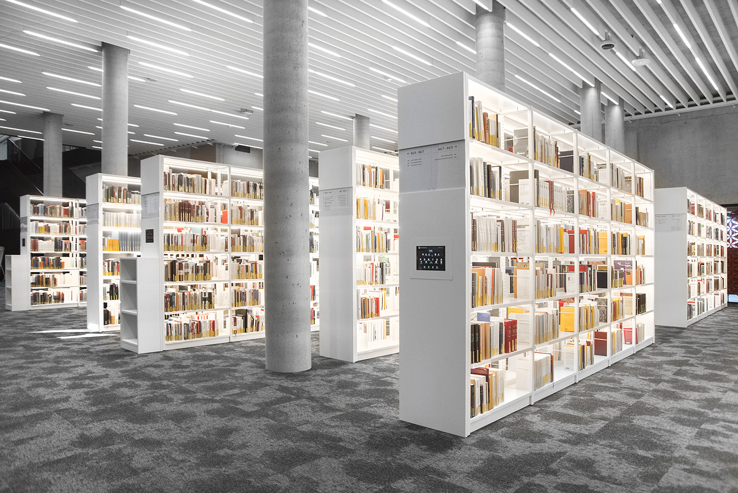 Pour son design épuré et fonctionnel à tout moment de la journée, nous avons opté pour un système de rayonnages Uniflex avec un éclairage LED intégré qui se décline sur pas moins de 10,7 km répartis sur cinq étages.