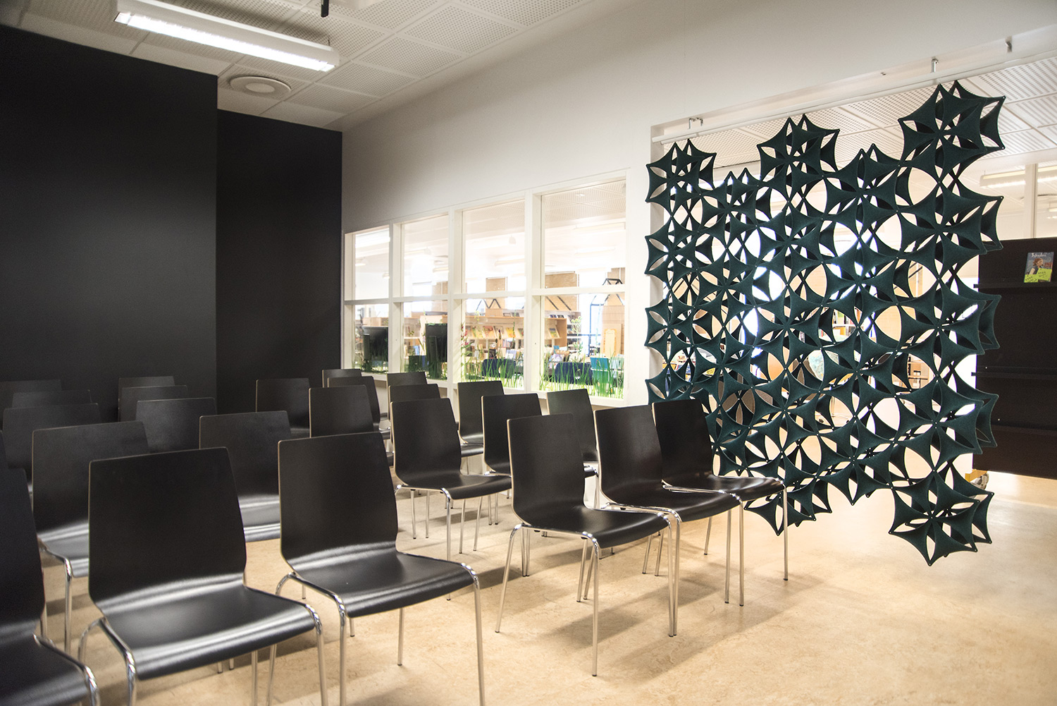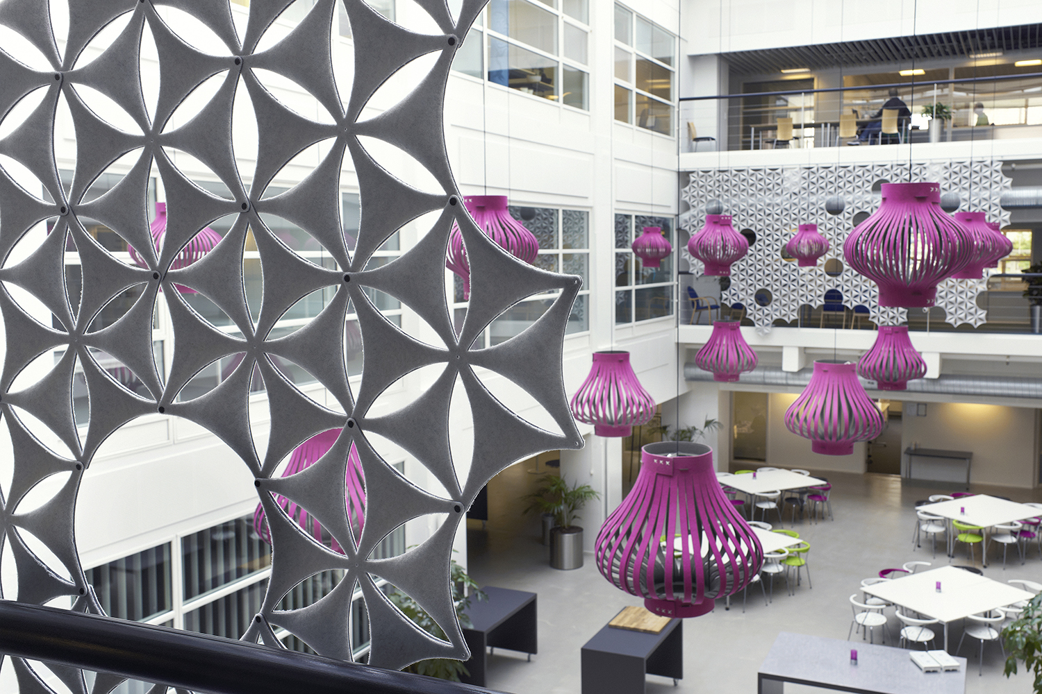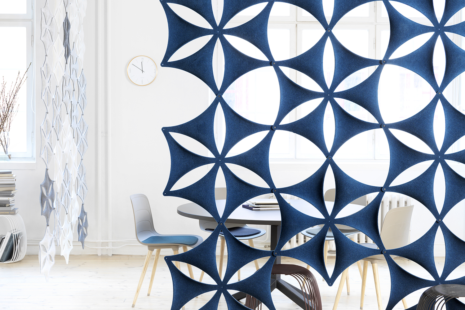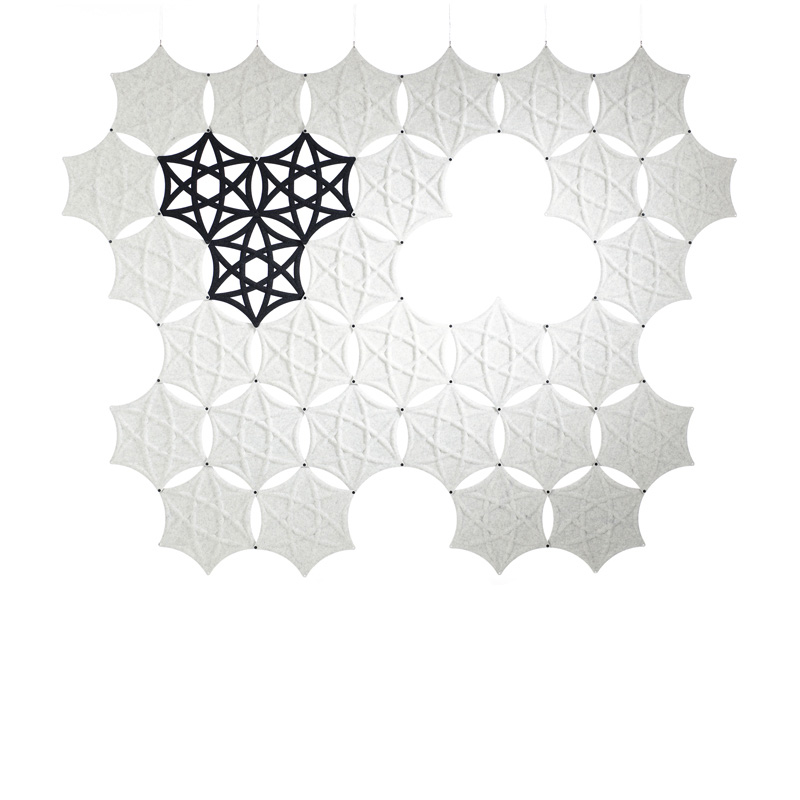 Airflake peut être utilisé de nombreuses façons pour former des espaces séparés au sein d’une pièce et assurer une parfaite diffusion acoustique. Le panneau est suspendu à l’aide d’un rail en aluminium ou d’attaches pour faux-plafond. Les modules sont combinés à l’aide de raccords en plastique.