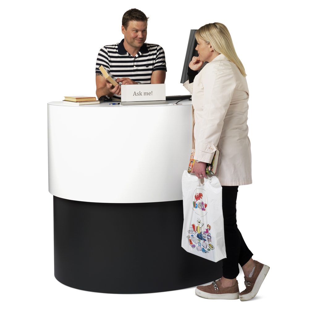 Info Pod doté d’un plan de travail de plus grandes dimensions. Elle sont réglables en hauteur et parfaites comme points d’information ou postes de consultation dans
