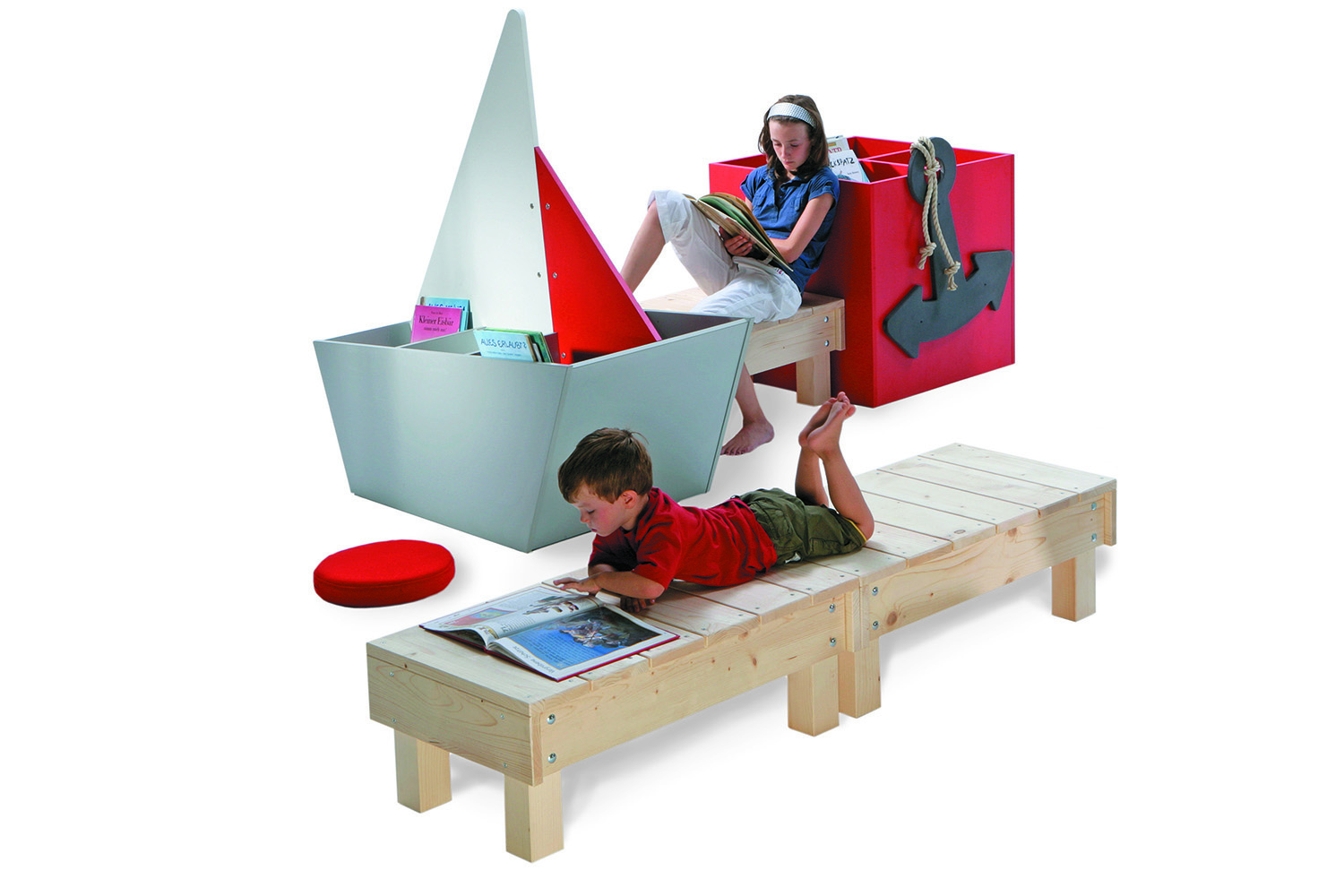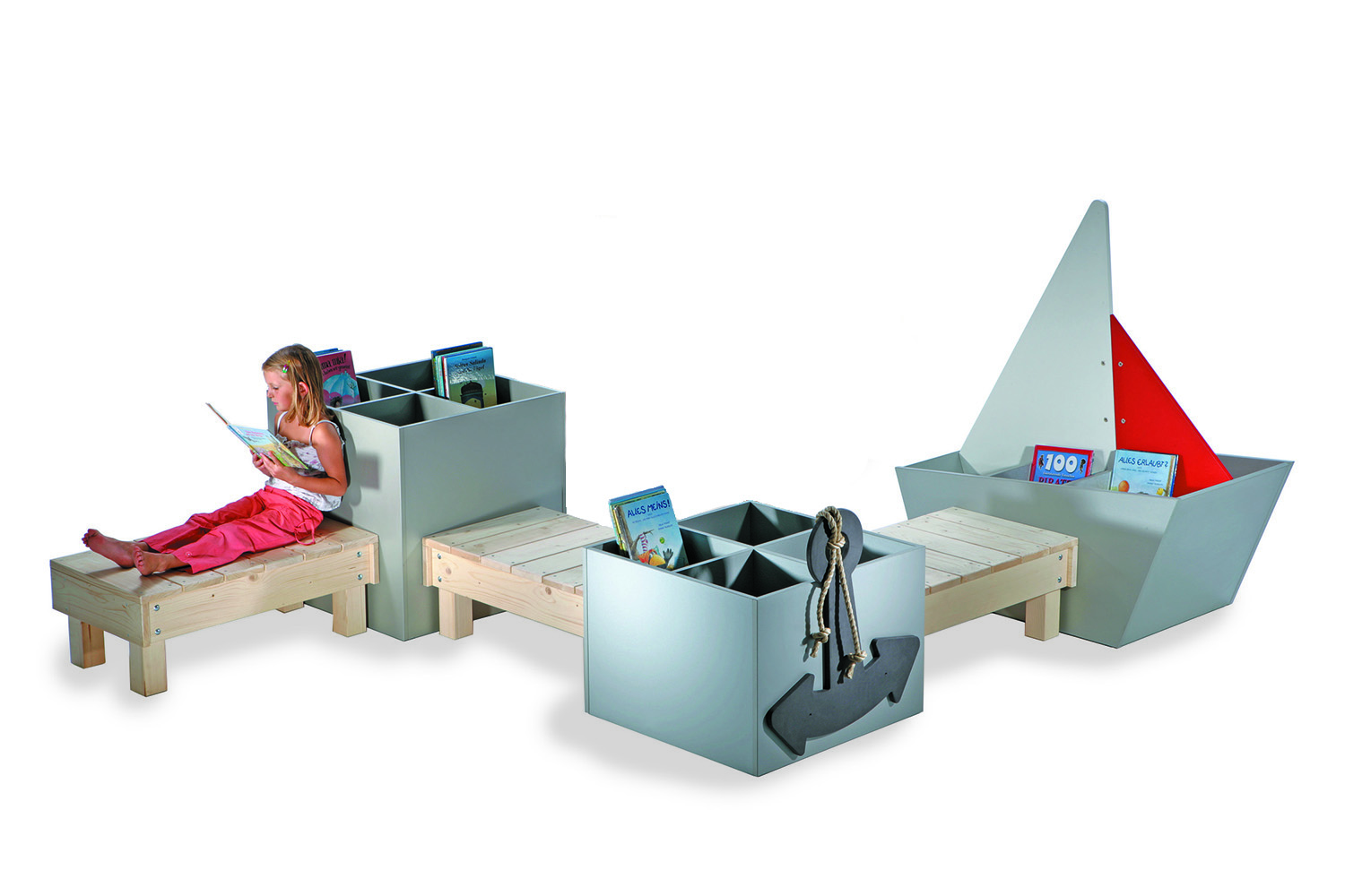 Les étonnants bacs à livres avec 6 casiers en forme de voiliers font beaucoup d’effet. La coque plus haute sur l’avant, souligne l’effet de dynamique du bateau et vous offre la possibilité de classer les livres par tranches d’âges : à l’arrière les livres pour les petits, au niveau de la proue, ceux pour les plus grands.