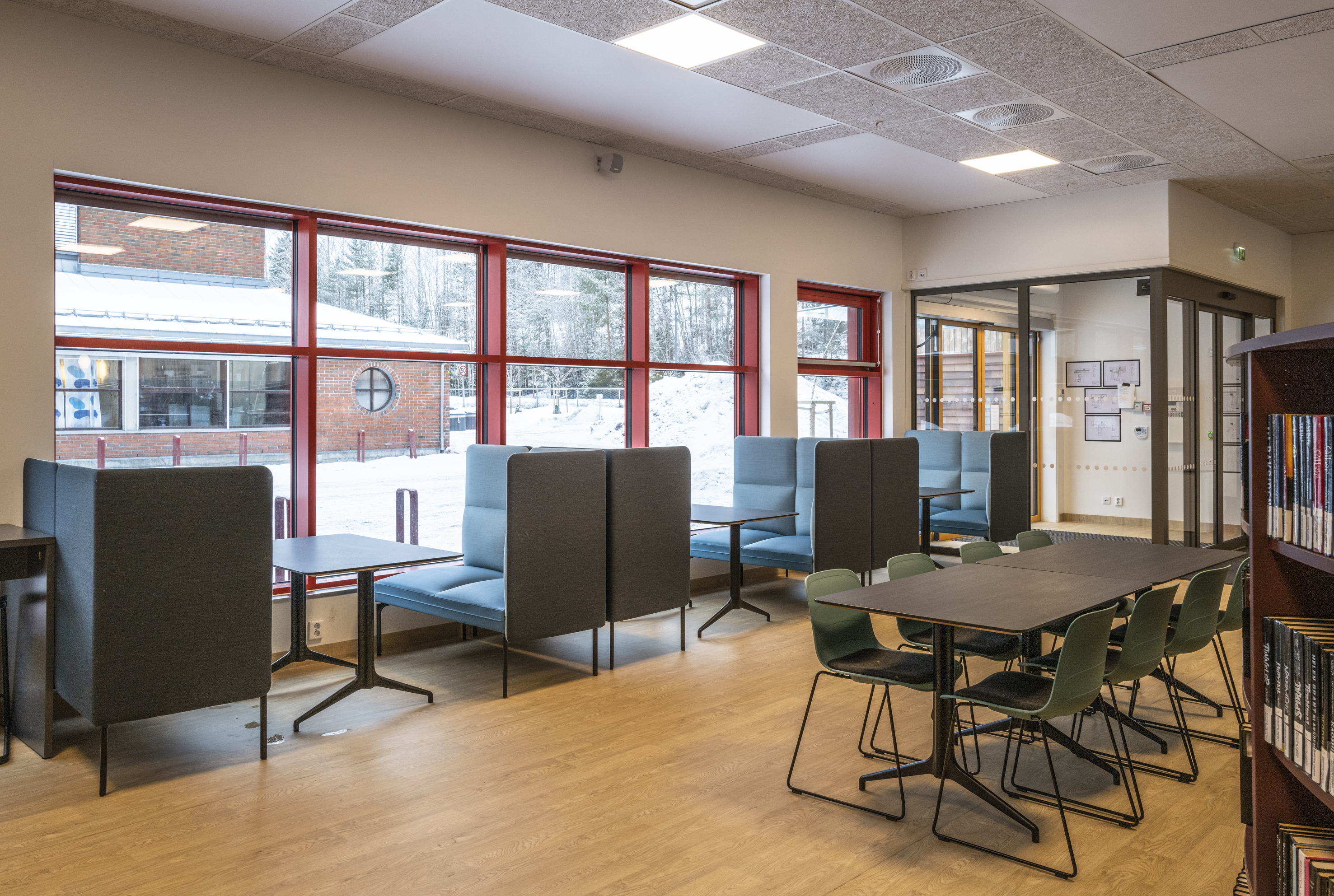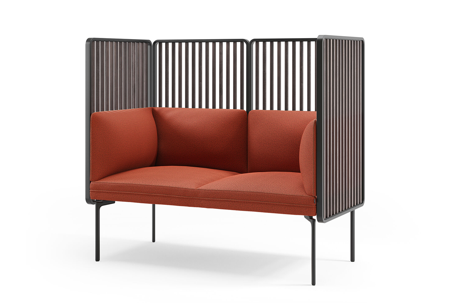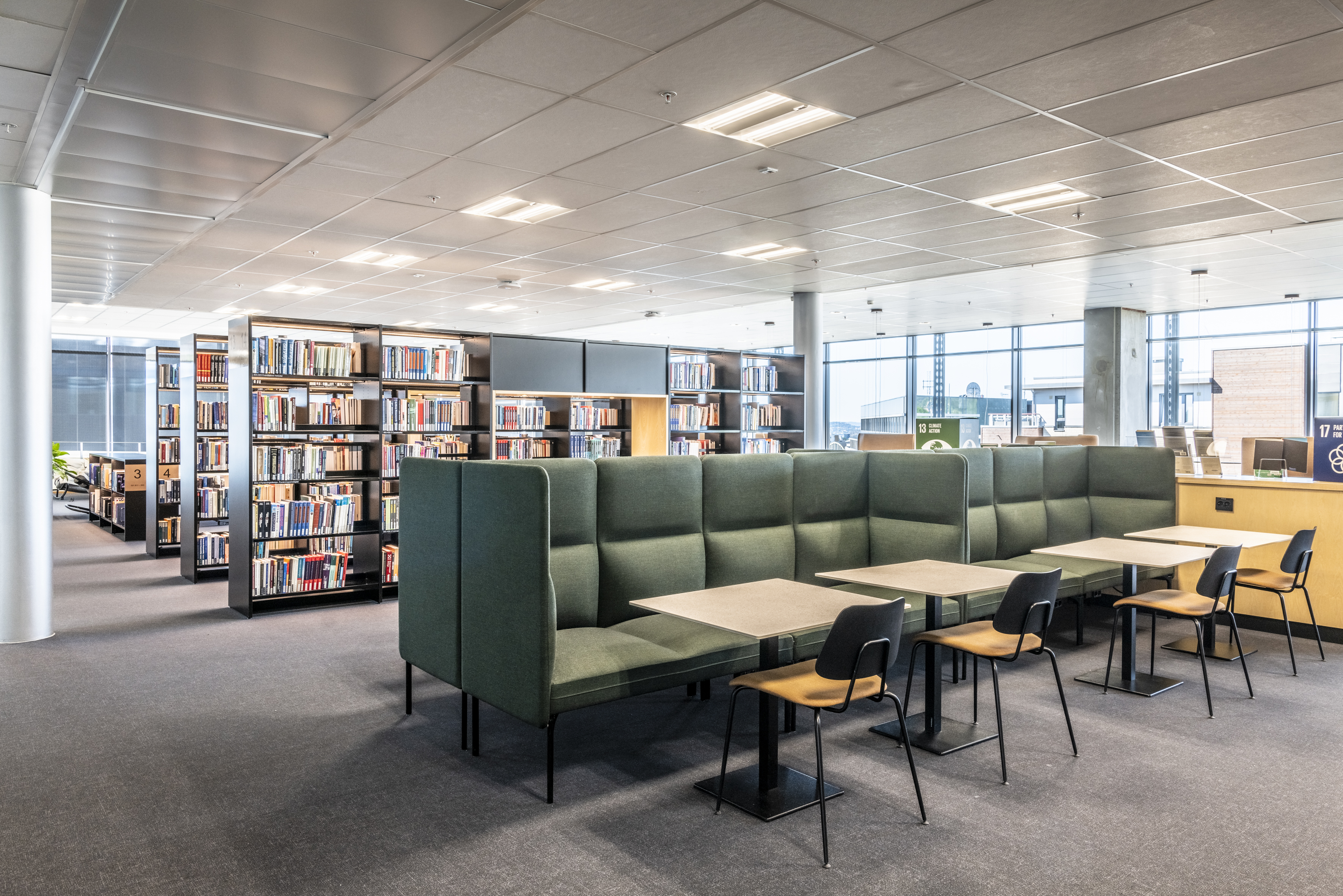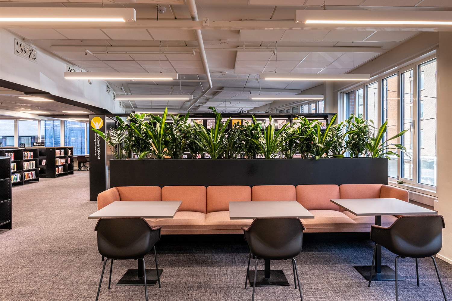La série Senso tient compte des défis acoustiques que vous pouvez rencontrer dans la bibliothèque. Ses différentes hauteurs de dossier contribuent à atténuer et absorber le bruit ambiant. Il est aussi possible de choisir une structure avec des lattes en chêne qui permettent de cloisonner la pièce en espace de calme, de détente ou de discussion.