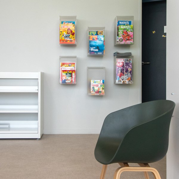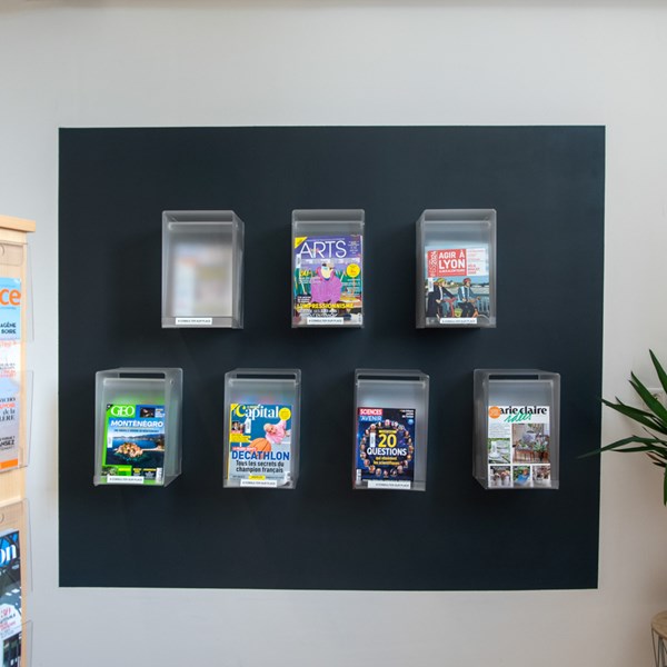 Casiers en acrylique destinés à la présentation et au rangement des périodiques.