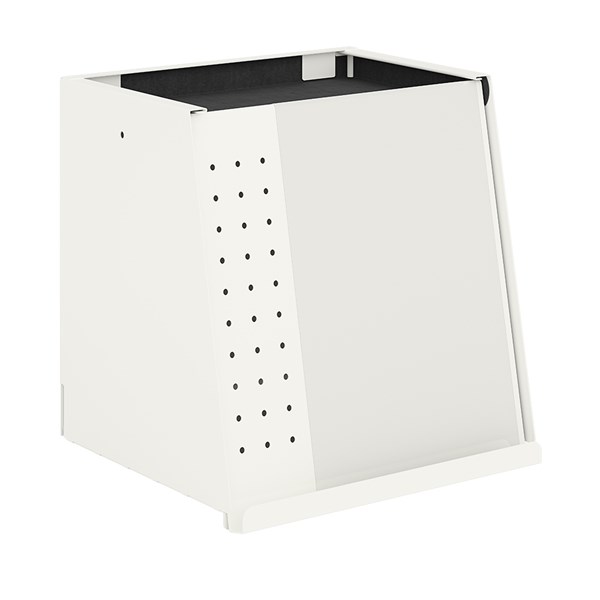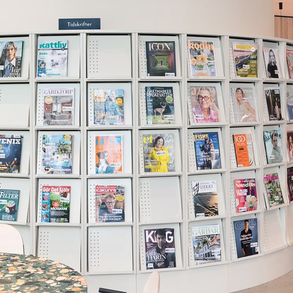 Boîte pratique pour étagère d’une profondeur maximale de 250 mm. Montre les périodiques avec la couverture tournée vers le visiteur.