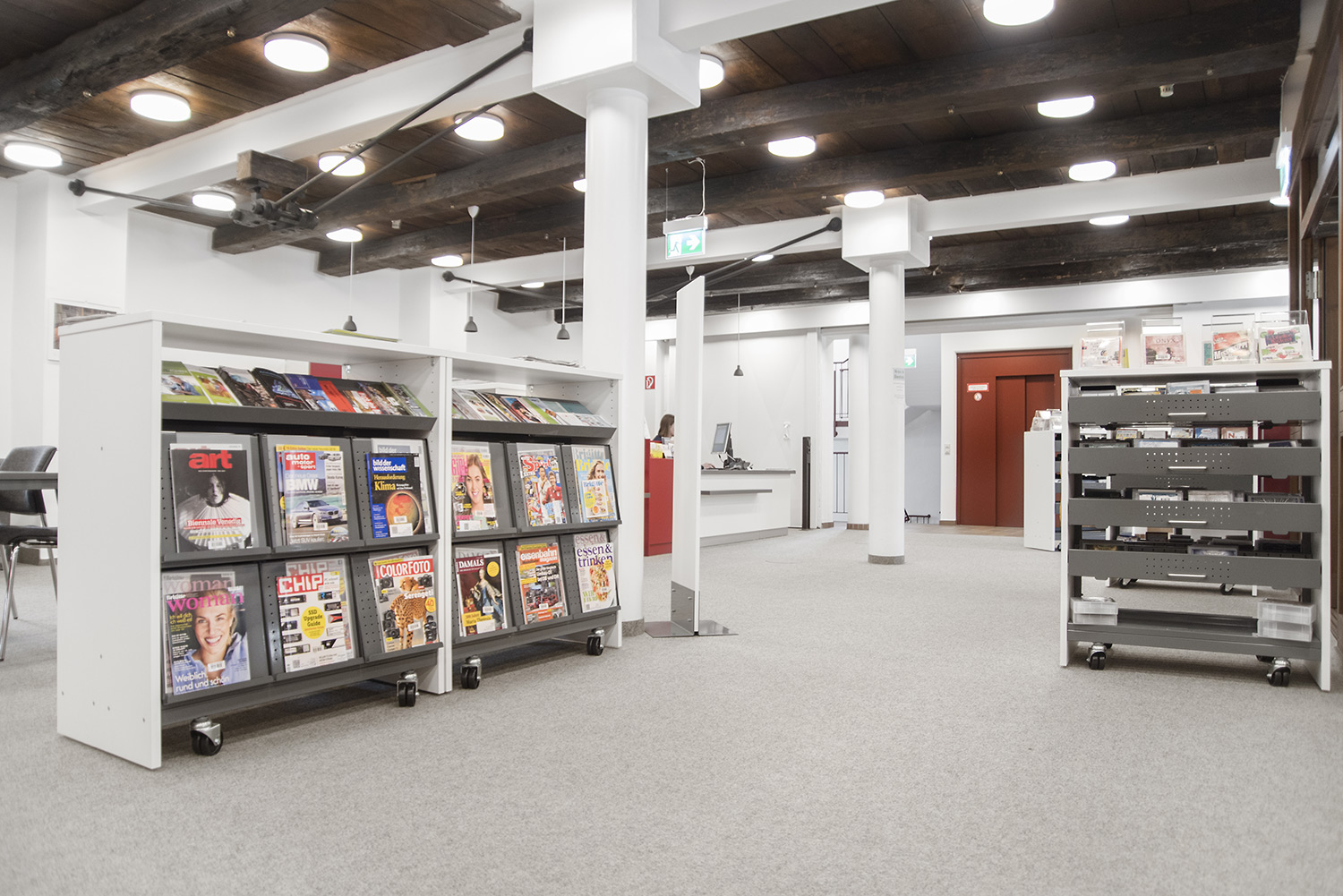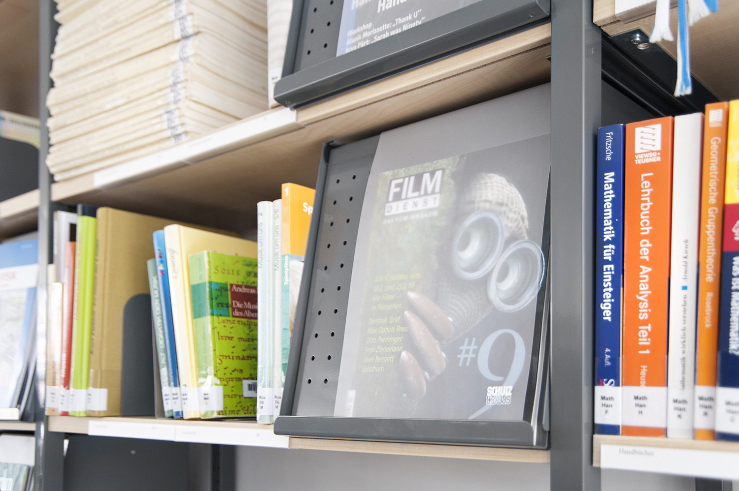 Boîte pratique pour étagère d’une profondeur maximale de 250 mm. Montre les périodiques avec la couverture tournée vers le visiteur.