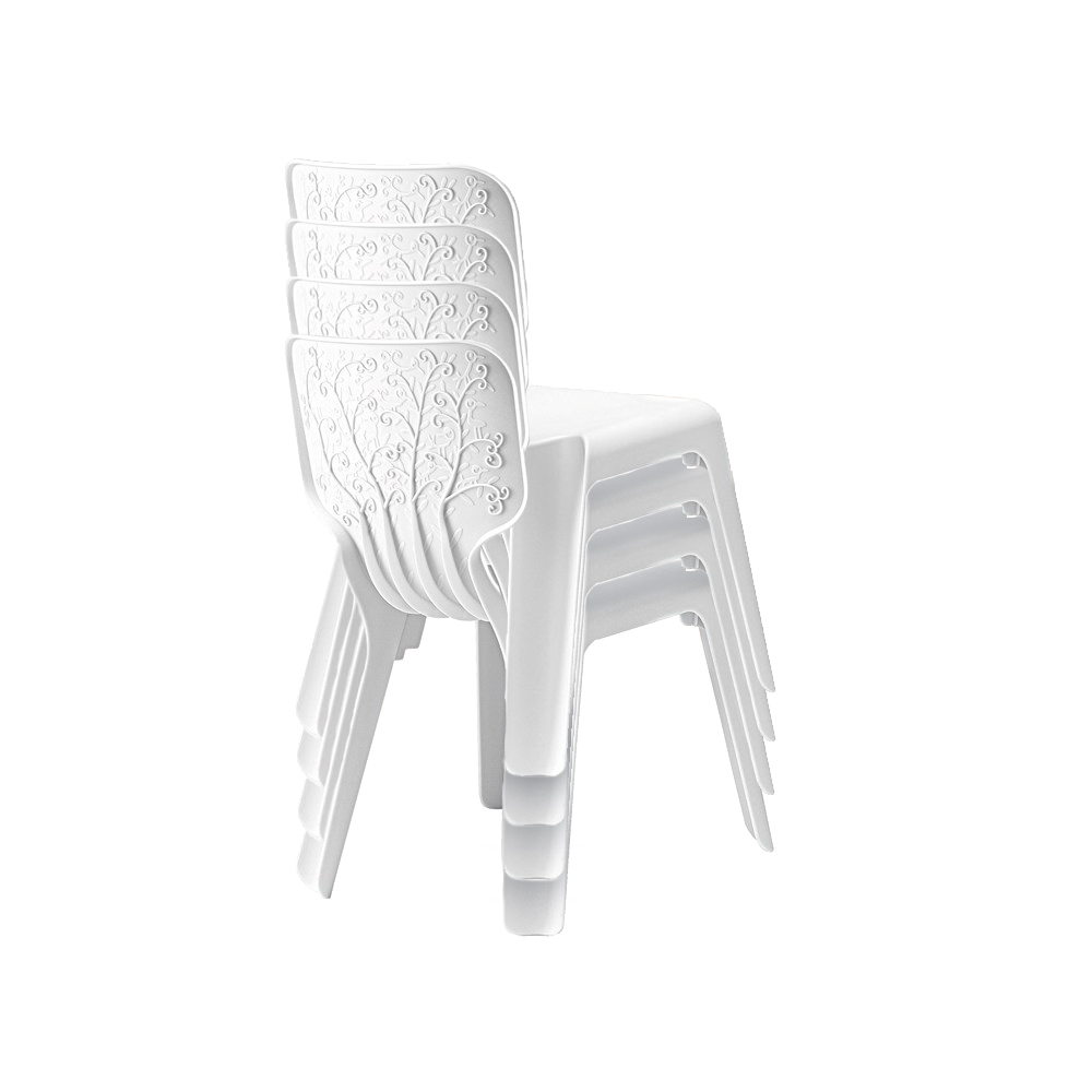 Une chaise légère et empilable avec une assise bien particulière. La face arrière du dossier est décorée d’un feuillage parsemé de petits oiseaux. La chaise est faite de fibre de verre renforcée de plastique aux couleurs représentant les quatre saisons de l’année : vert pour le printemps, orange vif pour l’été, brun pour l’automne et blanc pour l’hiver.