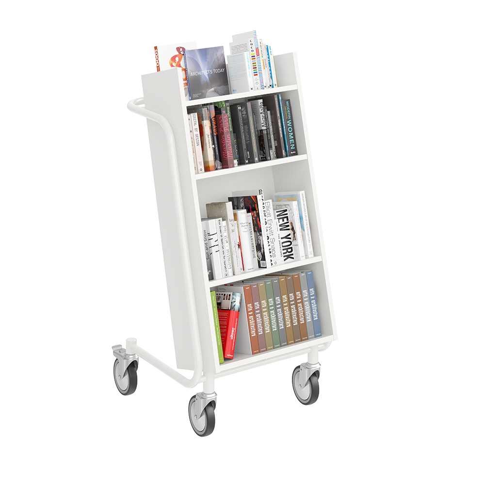 Chariot à livres ergonomique, simple face, équipé de 4 étagères. Les deux étagères centrales sont réglables pour s’adapter à différents formats de supports.