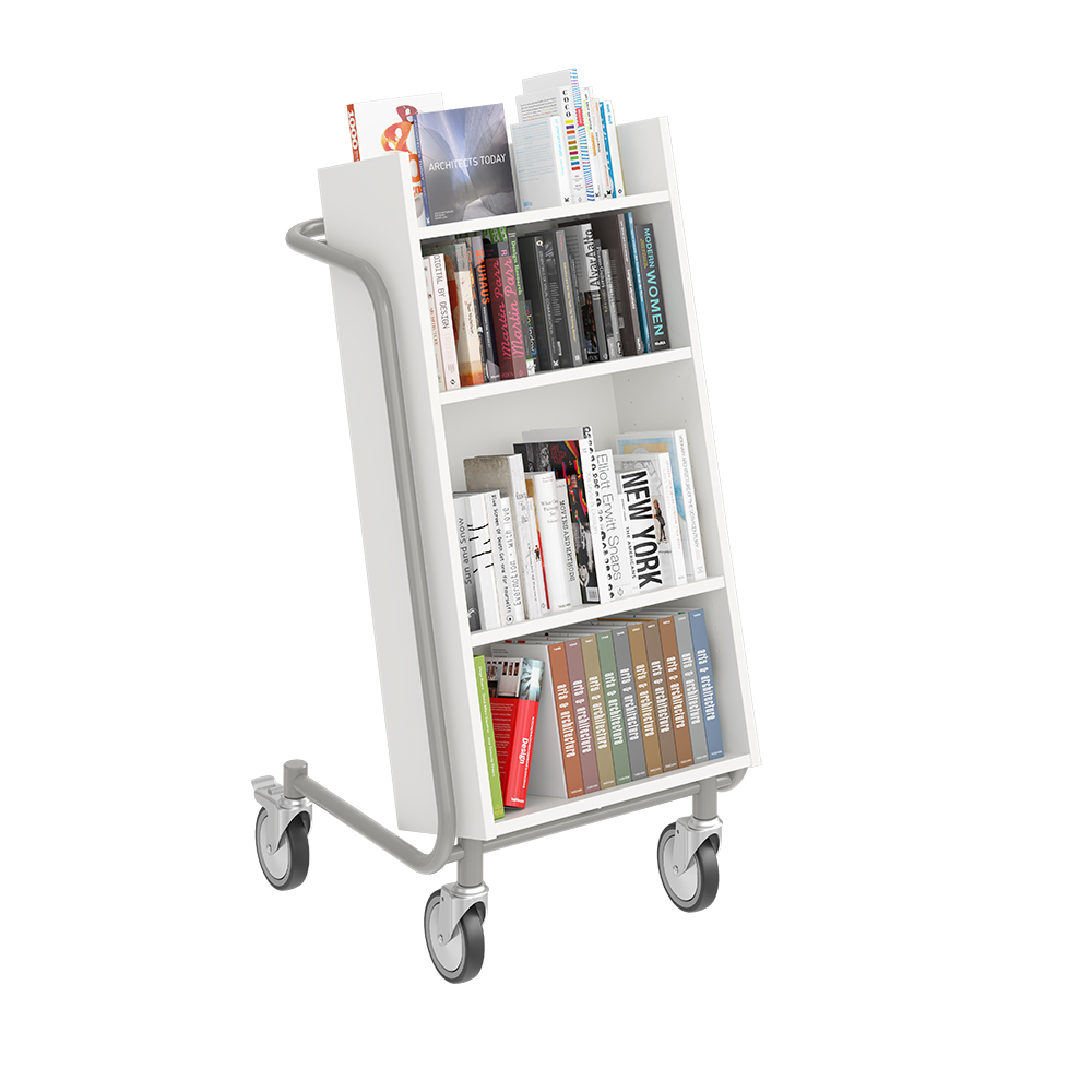 Chariot à livres ergonomique, simple face, équipé de 4 étagères. Les deux étagères centrales sont réglables pour s’adapter à différents formats de supports.