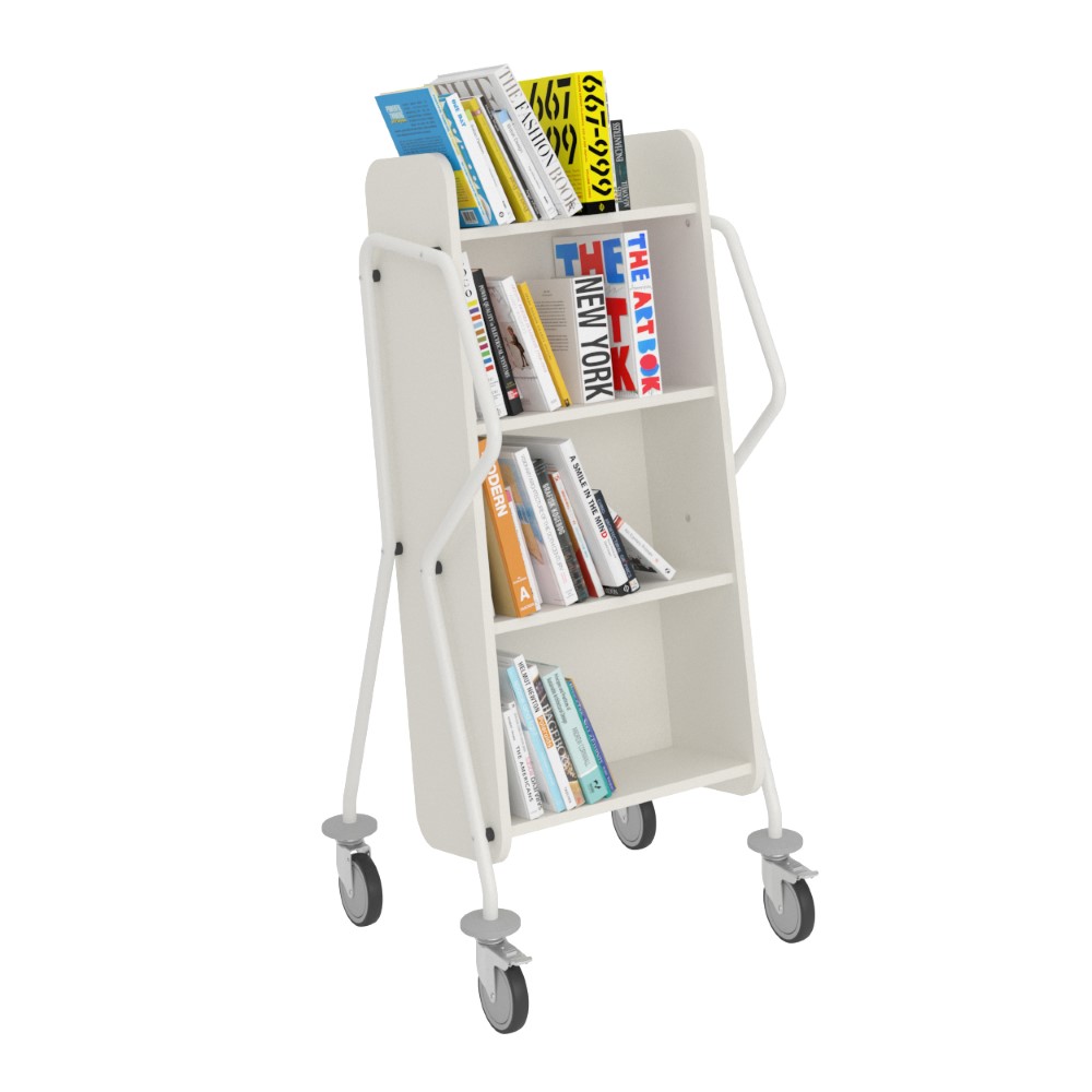 Chariot à 4 étagères fixes généreusement espacées et facilement inclinables. Convient aussi pour les livres de grand format.