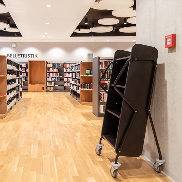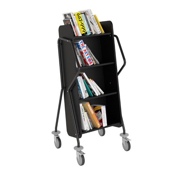 Chariot à 4 étagères fixes généreusement espacées et facilement inclinables. Convient aussi pour les livres de grand format.
