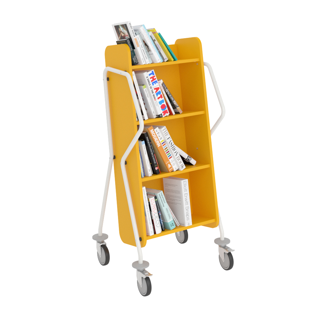 Chariot à 4 étagères fixes généreusement espacées et facilement inclinables. Convient aussi pour les livres de grand format.