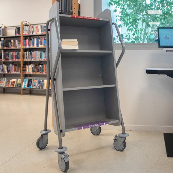Chariot à 4 étagères fixes généreusement espacées et facilement inclinables. Convient aussi pour les livres de grand format.