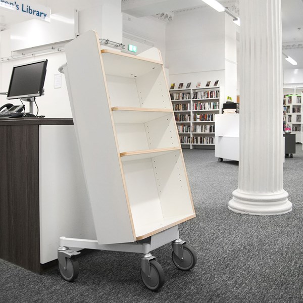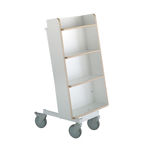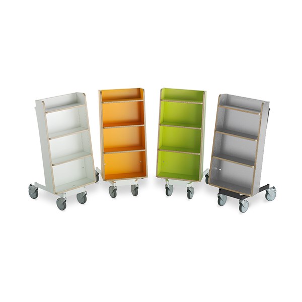 Chariot à livres ergonomique, simple face, équipé de 4 étagères. Les deux étagères centrales sont réglables pour s’adapter à différents formats de supports.