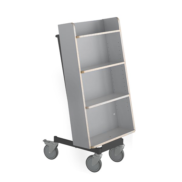 Chariot à livres ergonomique, simple face, équipé de 4 étagères. Les deux étagères centrales sont réglables pour s’adapter à différents formats de supports.