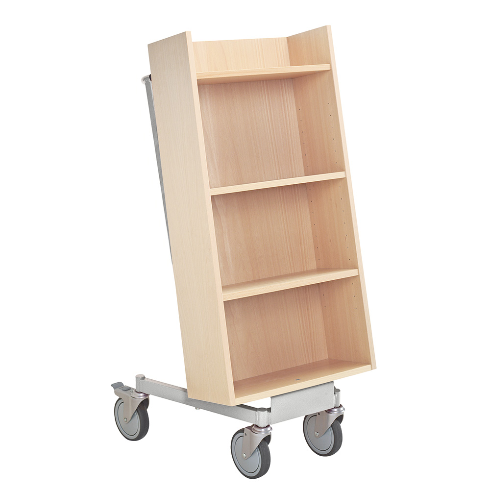 Chariot à livres ergonomique, simple face, équipé de 4 étagères. Les deux étagères centrales sont réglables pour s’adapter à différents formats de supports.