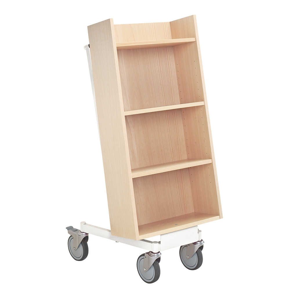 Chariot à livres ergonomique, simple face, équipé de 4 étagères. Les deux étagères centrales sont réglables pour s’adapter à différents formats de supports.
