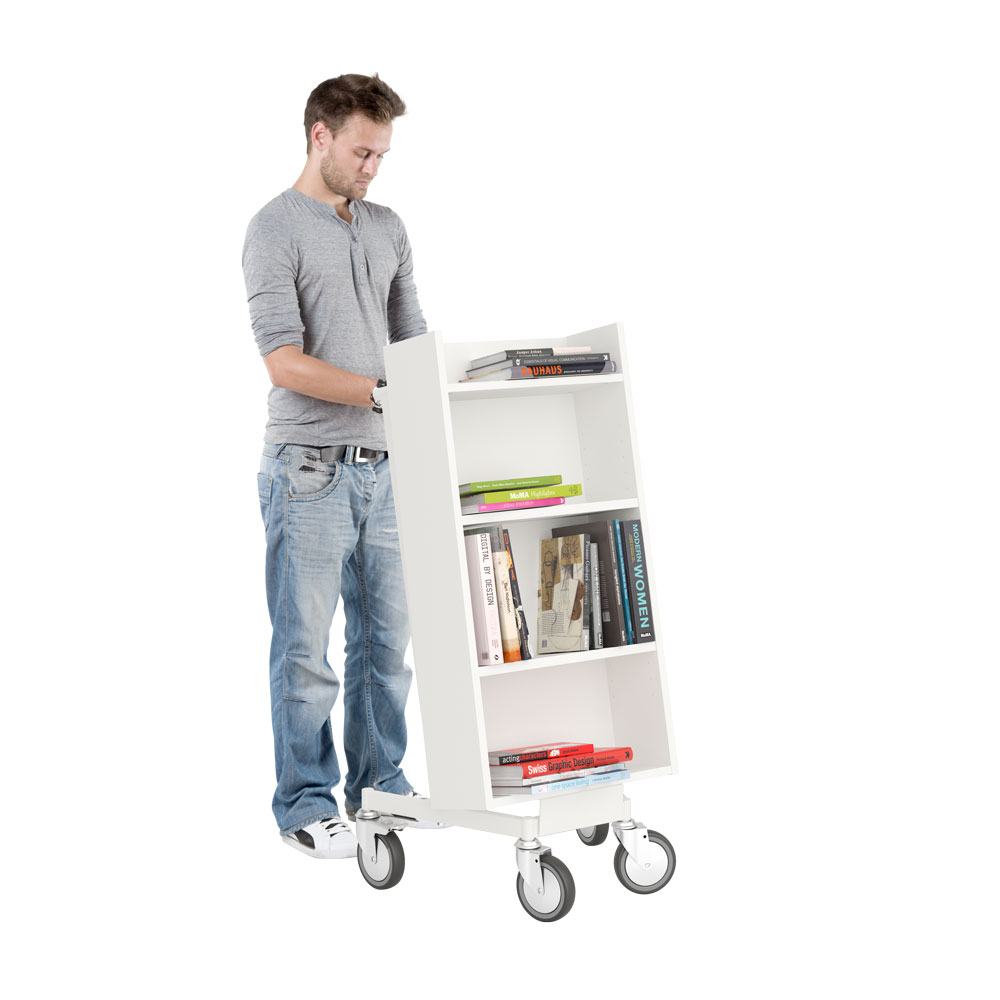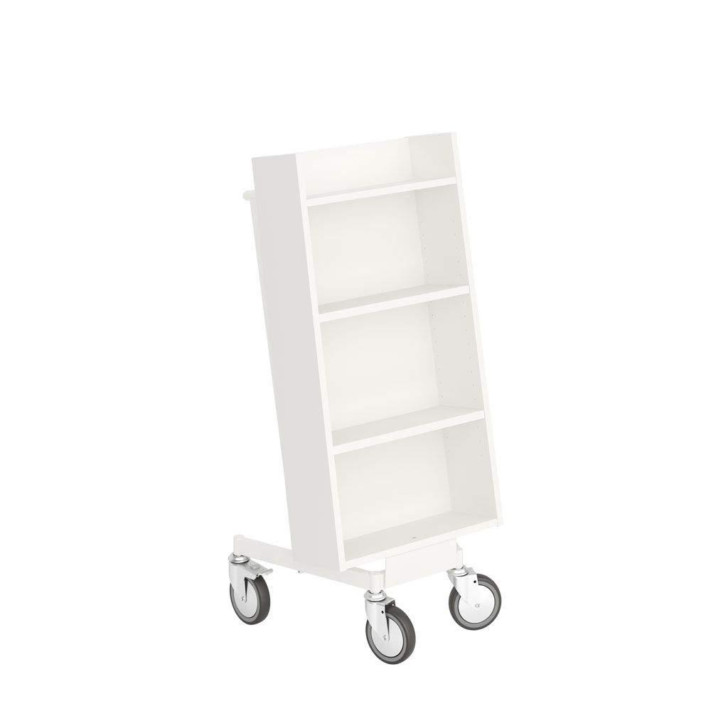 Chariot à livres ergonomique, simple face, équipé de 4 étagères. Les deux étagères centrales sont réglables pour s’adapter à différents formats de supports.