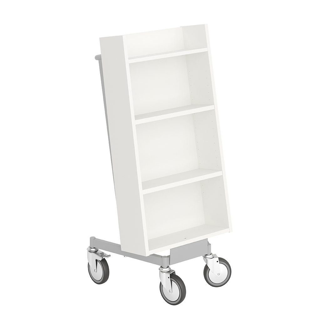Chariot à livres ergonomique, simple face, équipé de 4 étagères. Les deux étagères centrales sont réglables pour s’adapter à différents formats de supports.