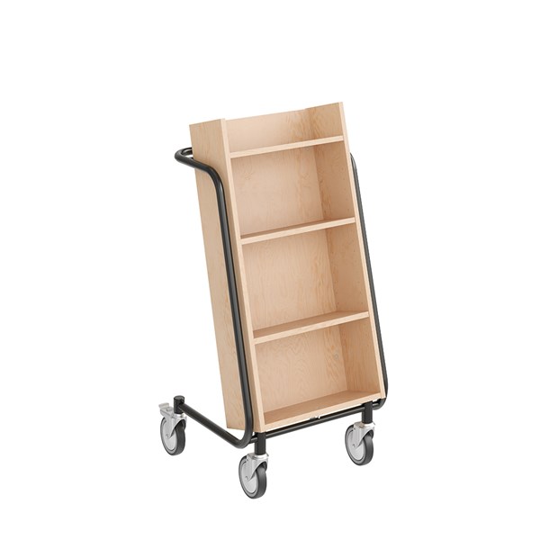 Chariot à livres ergonomique, simple face, équipé de 4 étagères. Les deux étagères centrales sont réglables pour s’adapter à différents formats de supports.