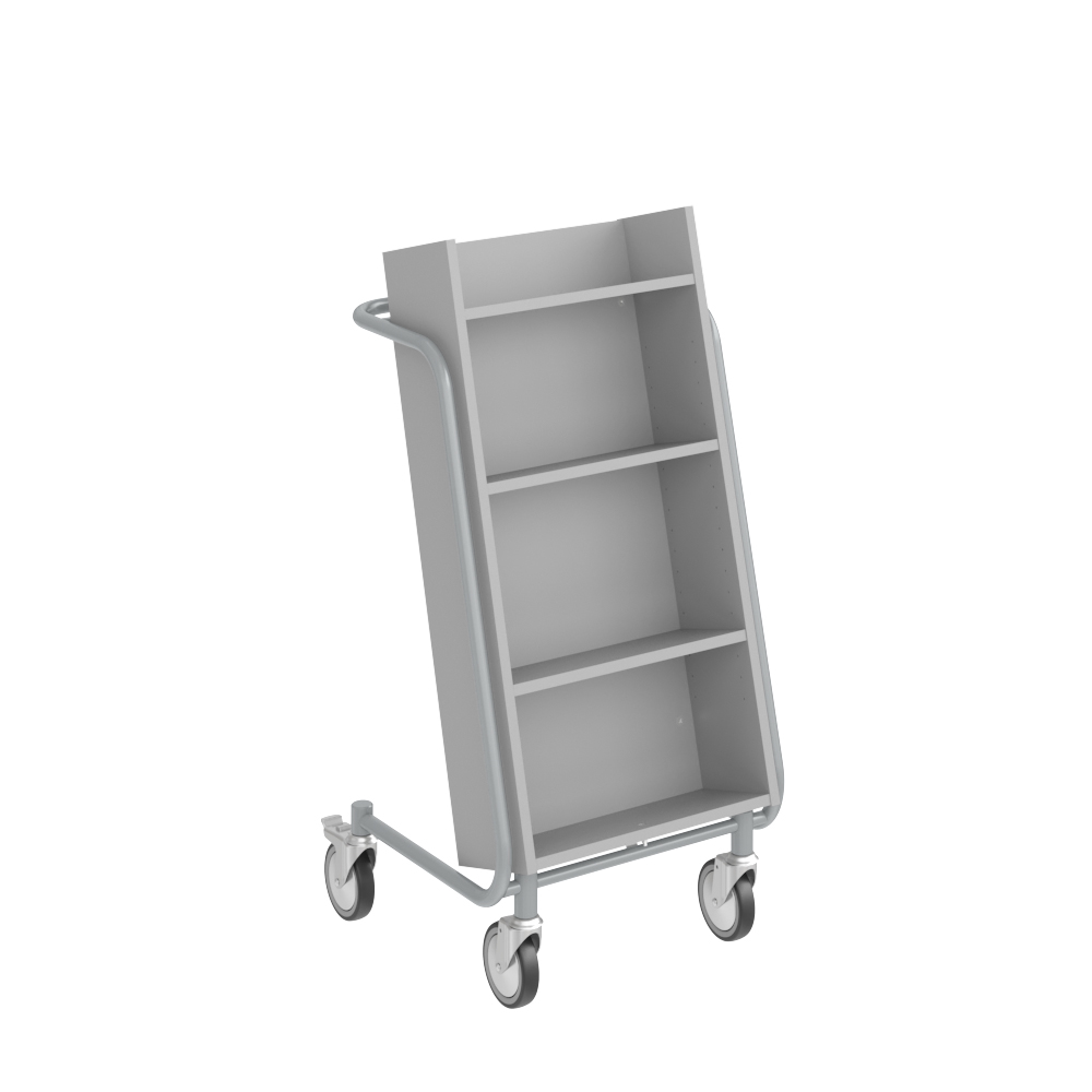 Chariot à livres ergonomique, simple face, équipé de 4 étagères. Les deux étagères centrales sont réglables pour s’adapter à différents formats de supports.
