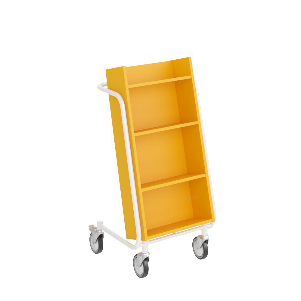 Chariot à livres ergonomique, simple face, équipé de 4 étagères. Les deux étagères centrales sont réglables pour s’adapter à différents formats de supports.