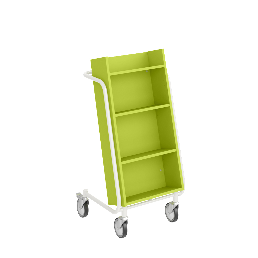 Chariot à livres ergonomique, simple face, équipé de 4 étagères. Les deux étagères centrales sont réglables pour s’adapter à différents formats de supports.