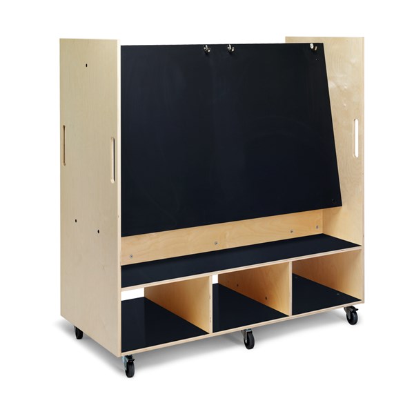 Surface de travail inclinée revêtue de laque pour tableau noir, support de papier et tablette pratique pouvant recueillir tout le matériel dont vous avez besoin instantanément comme la craie, les pinceaux et la peinture. Sans oublier un large espace de stockage dédié à ce matériel artistique.