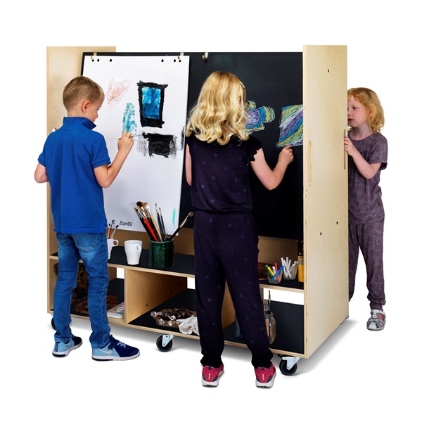 Chevalet autonome à double face et sur roulettes pouvant être utilisé simultanément par quatre jeunes créateurs.