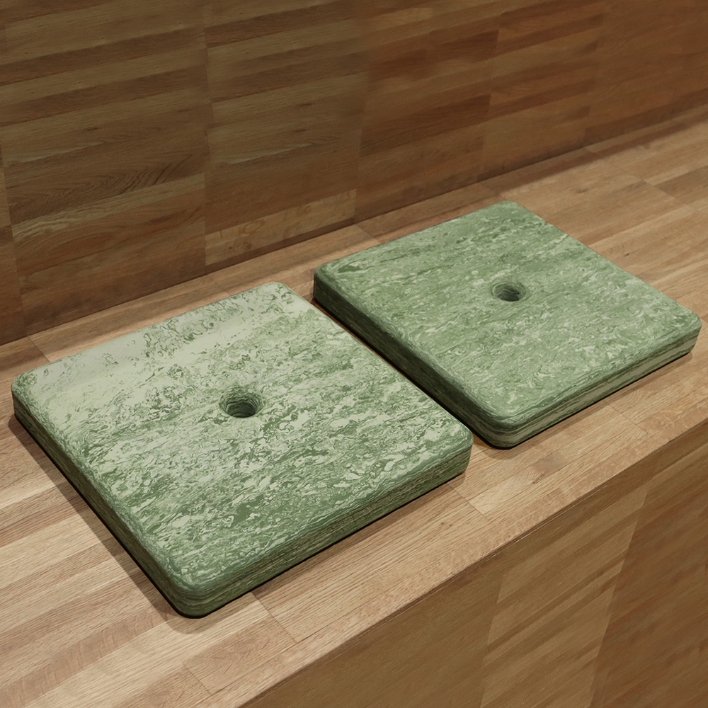 Les coussins sont disponibles dans plusieurs couleurs marbrées, inspirées par la nature. A poser sur le sol mais aussi sur gradins ou banquettes.