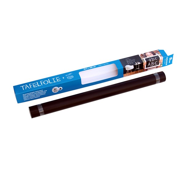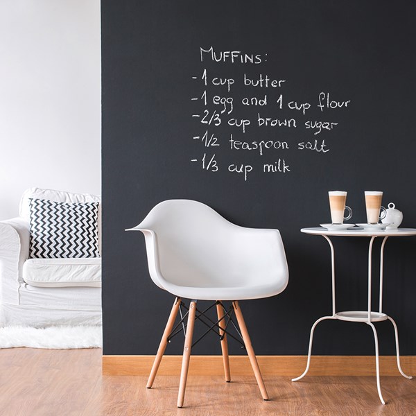 Film adhésif armé pour réaliser un grand tableau noir sur un mur ou une extrémité de rayonnage, ou plusieurs petits tableaux de formes diverses.