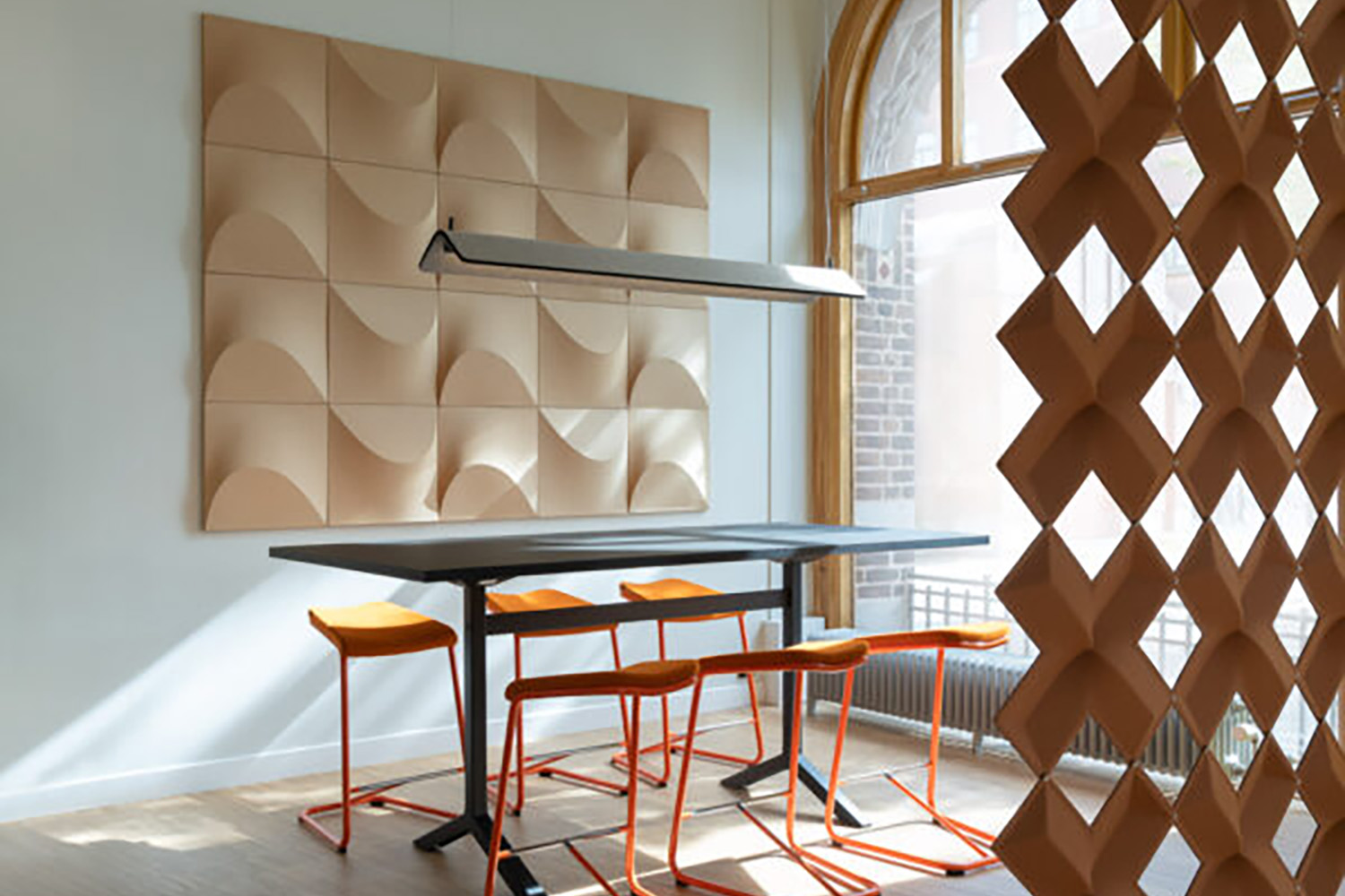 Des cloisons absorbantes permettent de contrôler l’acoustique relativement facilement. L’isolation des espaces ayant des usages différents permet de distinguer les différentes zones sur le plan visuel et acoustique. Pour cela, les cloisons à structure pleine et à surface absorbante sont les plus efficaces.