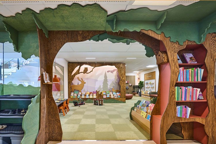 L’espace jeunesse, quant à lui, a été pensé pour les enfants mais aussi pour leurs parents, afin de leur permettre de partager des moments de lecture, de jeux sensoriels et des moments de complicité. Chaque détail a été pris en compte afin de créer un environnement où les enfants peuvent apprendre et découvrir grâce à leurs sens. Par exemple, les systèmes de rayonnages sont conçus pour ressembler à des arbres creux, tandis que de petites oasis avec des tapis moelleux ornés de motifs naturels et d’animaux de la forêt sont disséminés un peu partout, contribuant à une atmosphère chaleureuse et accueillante.