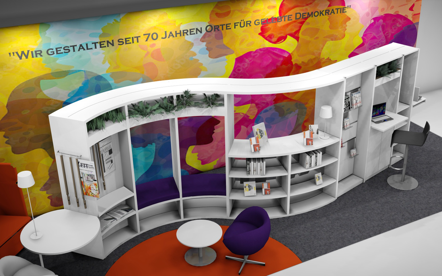 L’élément central de notre stand a été un mur de fond soigneusement pensé et richement coloré, illustrant de manière vivante notre engagement en faveur de l’inclusion sociale et des valeurs démocratiques dans les bibliothèques. Ce visuel fort a également été mis en valeur par un mobilier aux lignes élégantes, décliné dans des tons blancs et neutres, créant ainsi un contraste soulignant notre message engagé et haut en couleur.