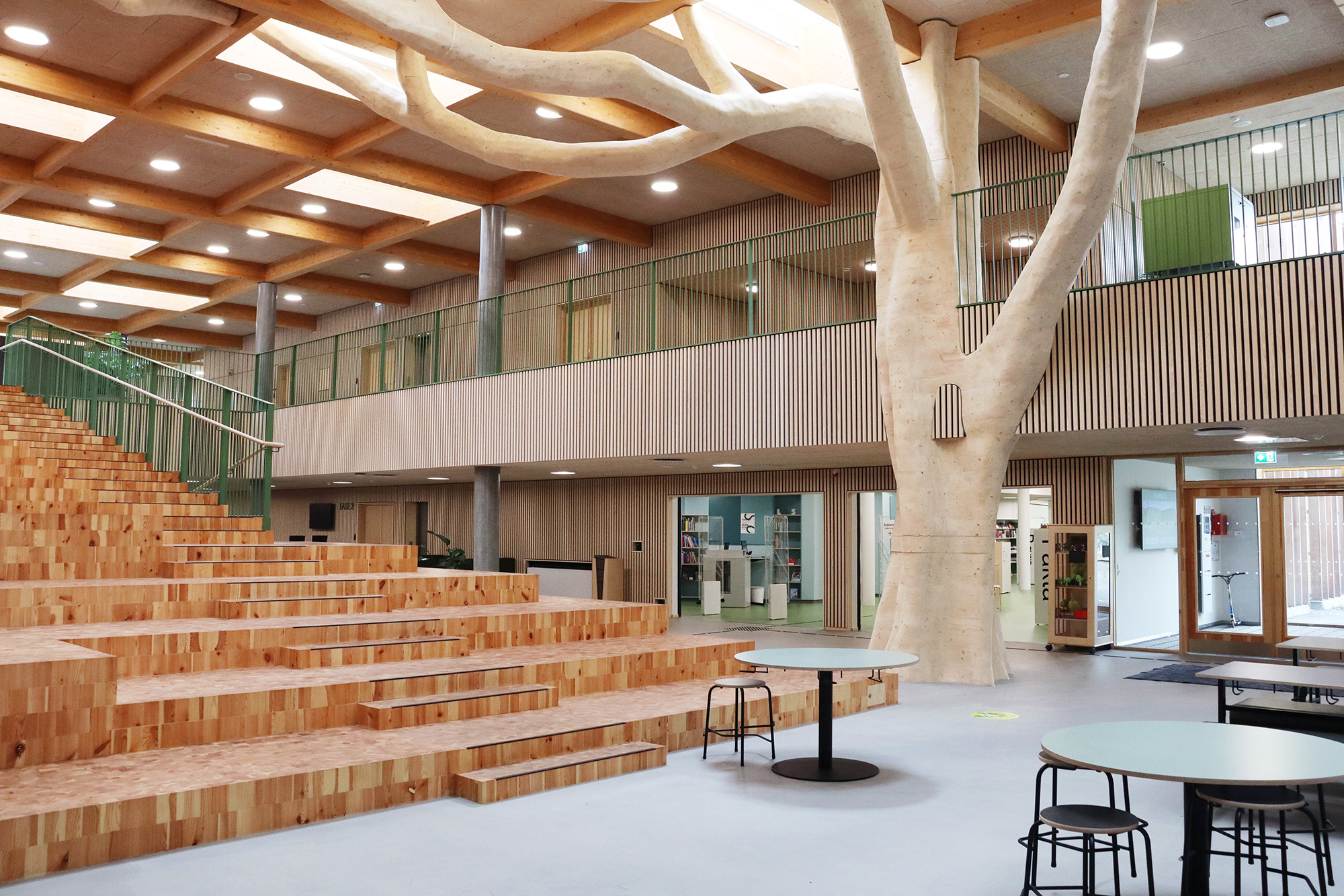 Dans le cadre du projet, nous, à la bibliothèque, sommes très fiers que la Maison des jeunes et de la culture de Vrå ait remporté le prix de la meilleure construction scolaire de l'année 2022. La forêt et la nature sont des éléments présents partout dans tout le bâtiment et où la bibliothèque représente les racines. Ces racines symbolisent les fruits de la connaissance, de la littérature et de la compréhension, et c'est aussi là que les nouvelles idées folles et sauvages apparaissent et se ramifient.