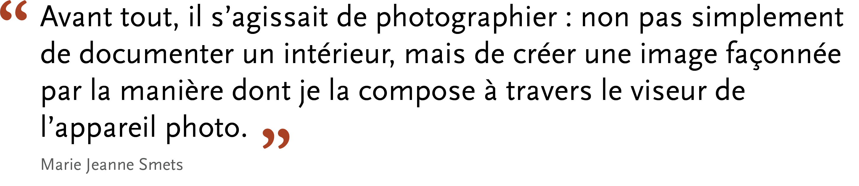 Le chemin vers la photographie n’a pas commencé avec un appareil photo, mais avec du papier millimétré et des esquisses d’intérieurs. En 1981, Marie Jeanne Smets cofonde Schulz Benelux, où elle exerce comme architecte d’intérieur, et plus particulièrement en qualité de responsable de projets à travers toute la région du Benelux. Le mobilier provenait de Schulz Speyer en Allemagne, et dès cette époque, la collaboration internationale faisait naturellement partie de son univers professionnel.