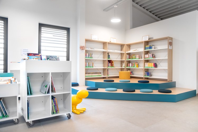 Lorsque des classes scolaires visitent la bibliothèque, les élèves s’installent souvent en demi-cercle autour des podiums et gradins, ce qui permet d’optimiser l’espace et de favoriser des échanges ainsi que des présentations de livres. Pour les plus jeunes, ces podiums servent à des lectures interactives et à la lecture de comptines. Anna soutient, concernant ces podiums que : « ces aménagements sont idéaux pour passer facilement de la position assise à debout, ce qui est parfait pour ce type d’activités ». Pendant les périodes de vacances, les podiums sont également utilisés pour des séances de projection : les familles peuvent s’y installer confortablement pour regarder un film.