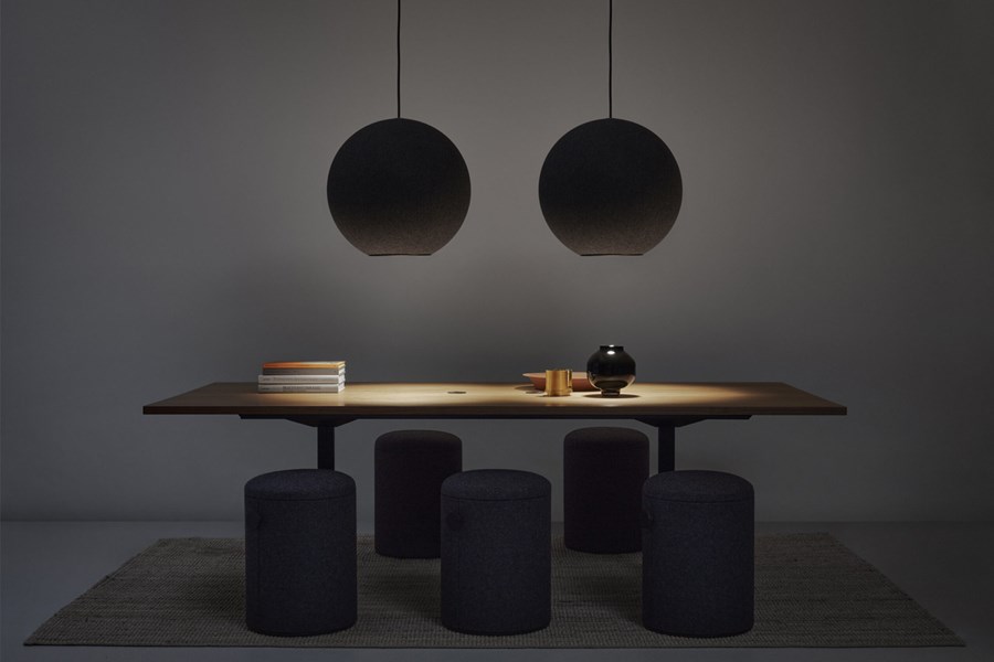 Elle offre un équilibre harmonieux entre fonctionnalité et esthétique, créant une ambiance agréable où les niveaux sonores sont réduits sans pour autant compromettre la qualité de l’éclairage. Sa coque extérieure, ronde et élégante, est conçue en feutre de polyester disponible en plusieurs couleurs, tandis que son noyau acoustique est fabriqué à partir de PET recyclé, combinant ainsi performance et durabilité.