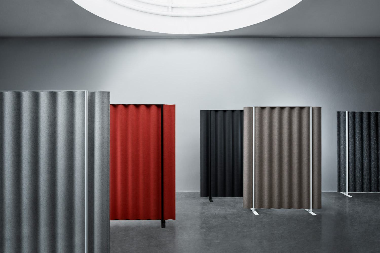 Les cloisons, écrans de bureau et panneaux suspendus sont recouverts de textiles sur leurs deux faces.