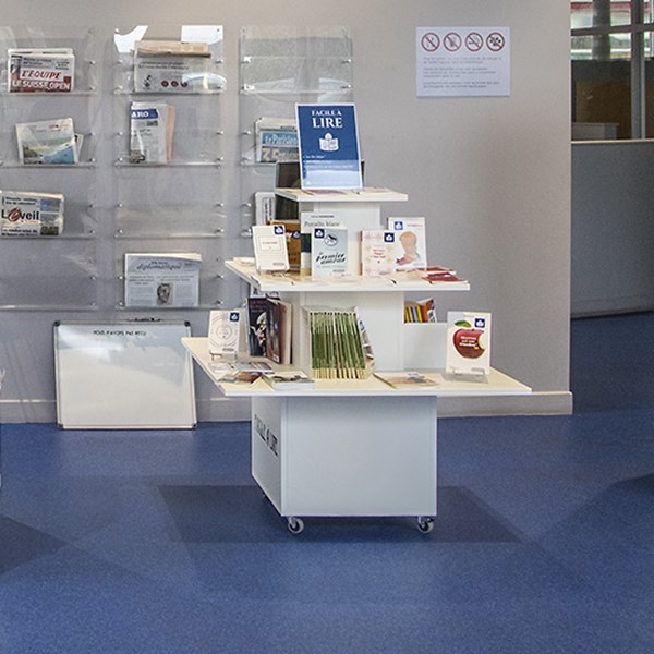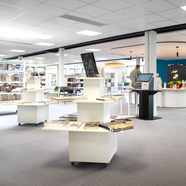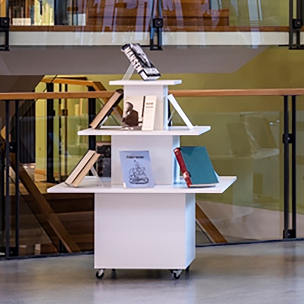 Podium fonctionnel et polyvalent pour la présentation de livres et/ou autres médias. Idéal pour attirer l’attention à l’entrée ou pour créer des zones de présentation dans votre bibliothèque.