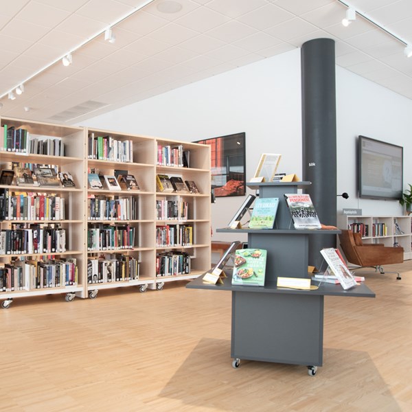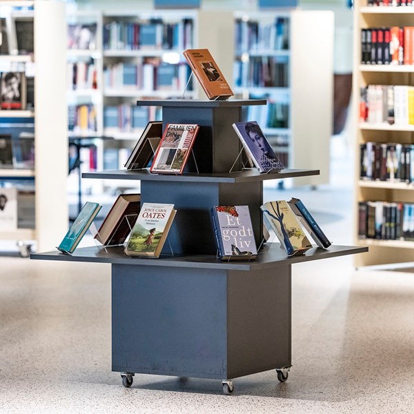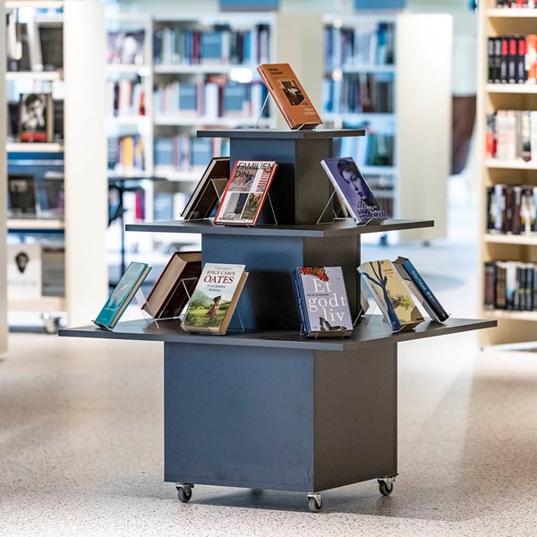 Podium fonctionnel et polyvalent pour la présentation de livres et/ou autres médias. Idéal pour attirer l’attention à l’entrée ou pour créer des zones de présentation dans votre bibliothèque.