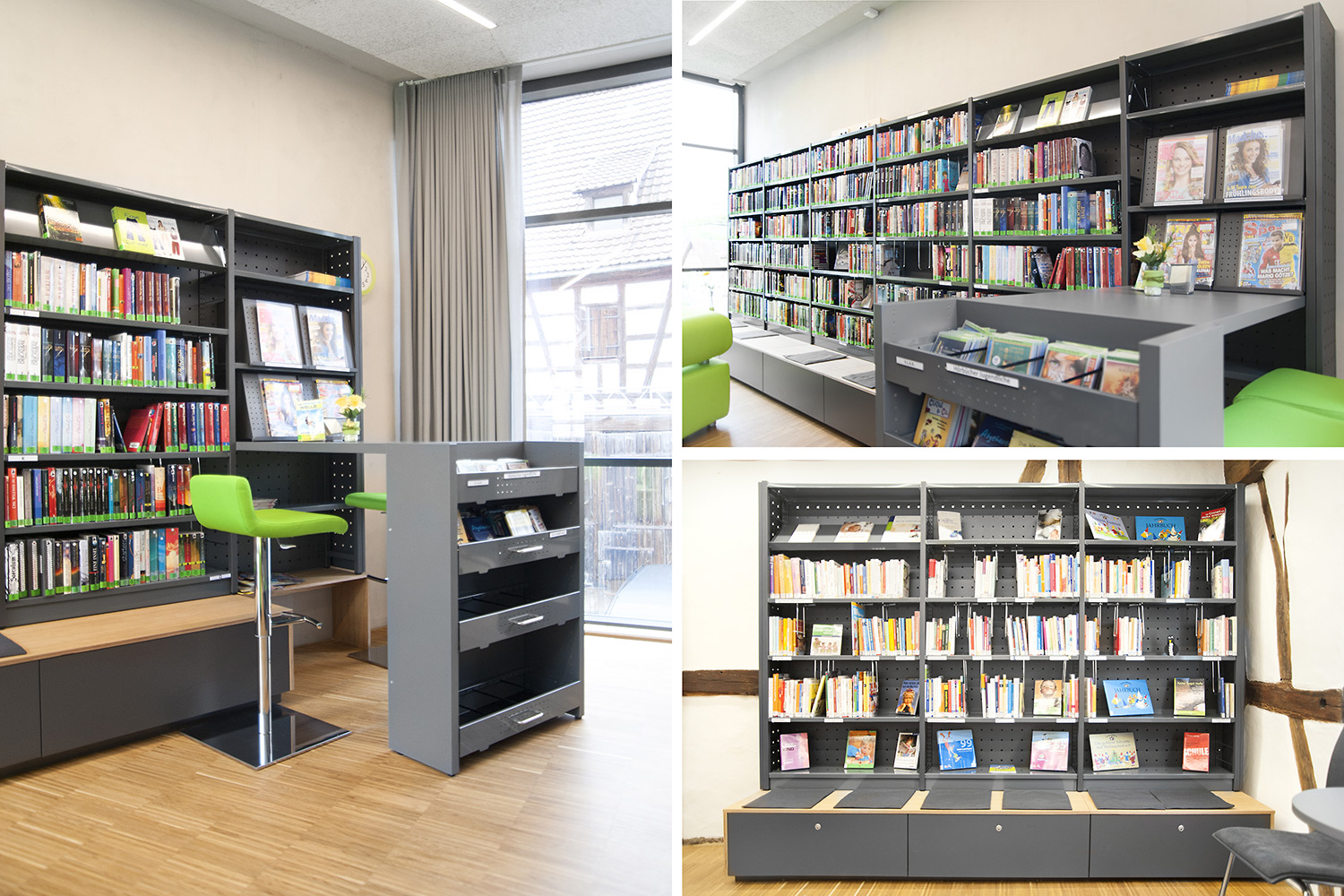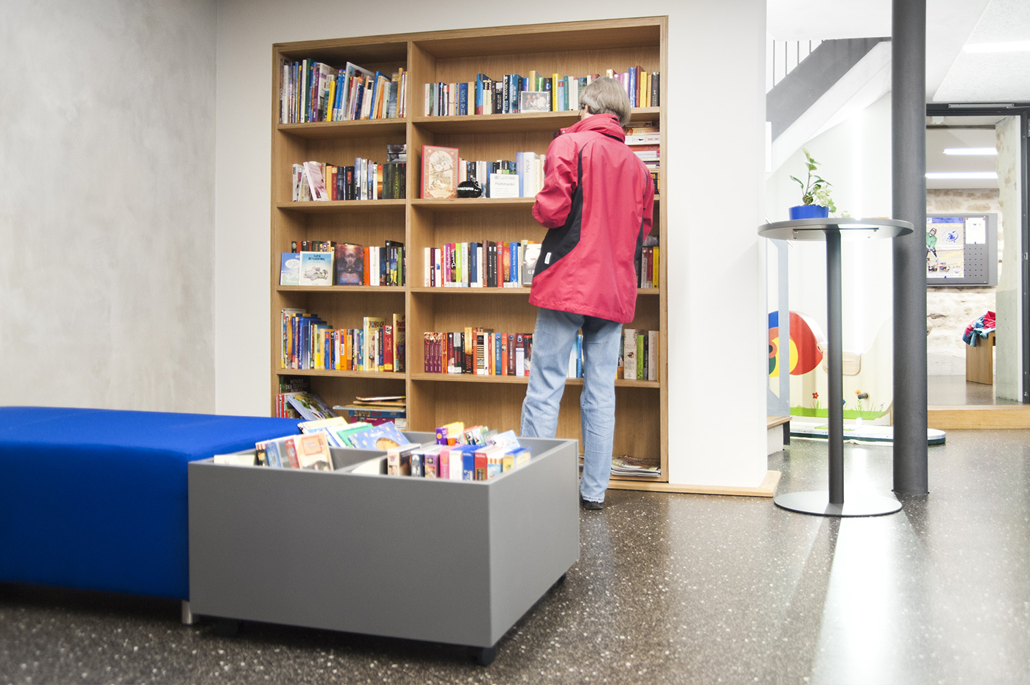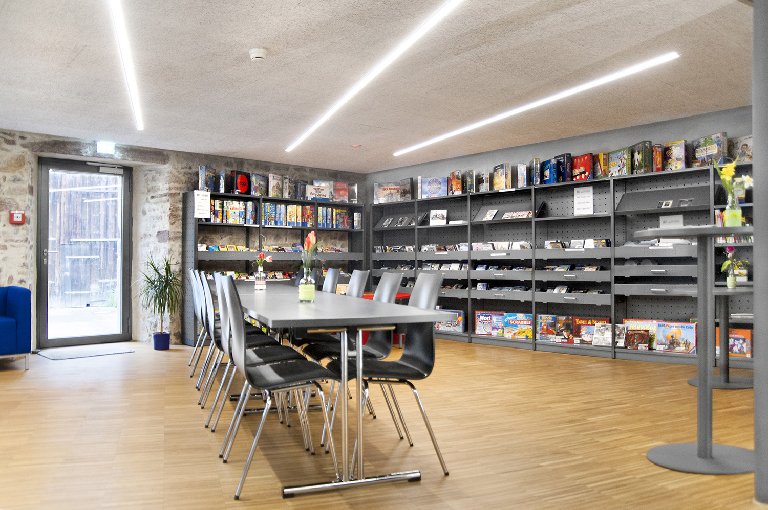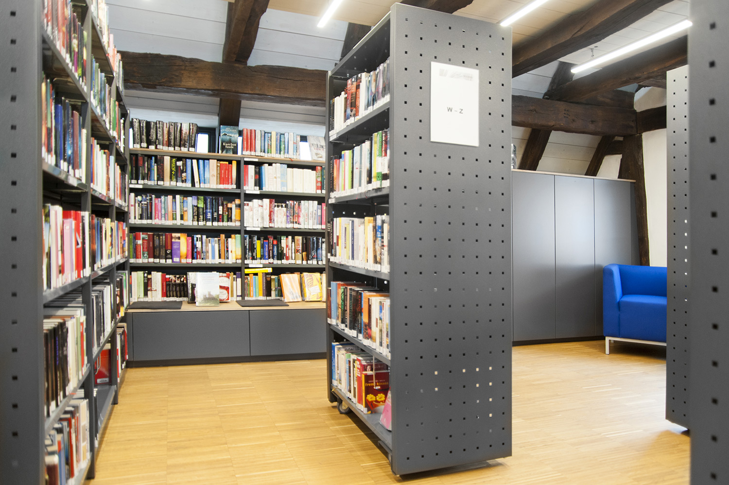 En 2015, la bibliothèque publique d’Ehningen a déménagé dans son ancienne implantation dans un bâtiment scolaire pour rejoindre une maison rénovée aux accents modernes, mais ayant conservé une structure à poteaux et à poutres apparents.