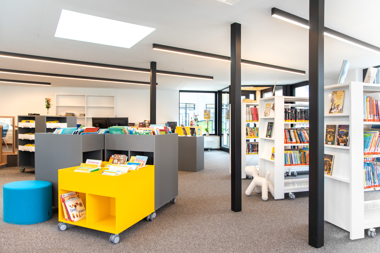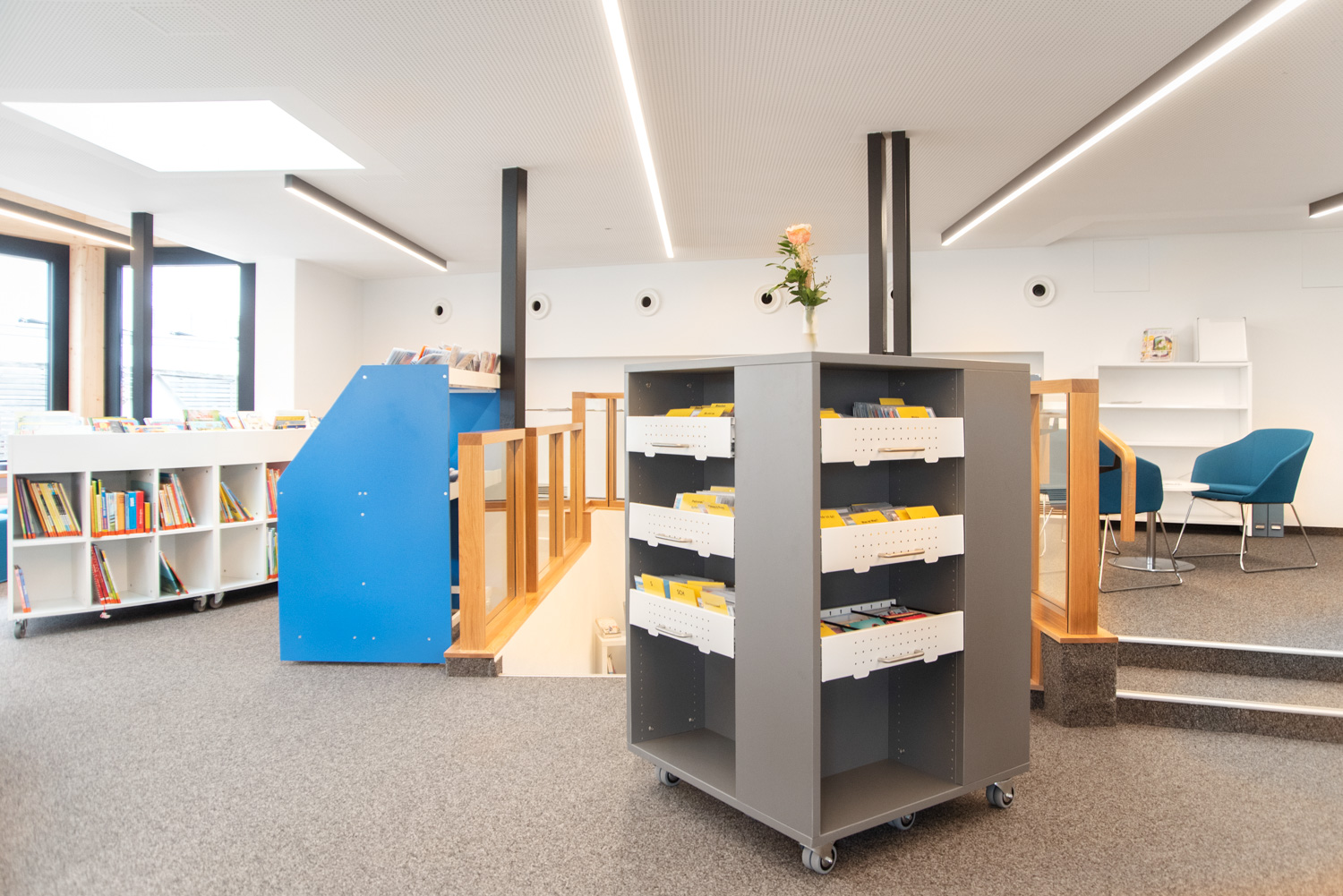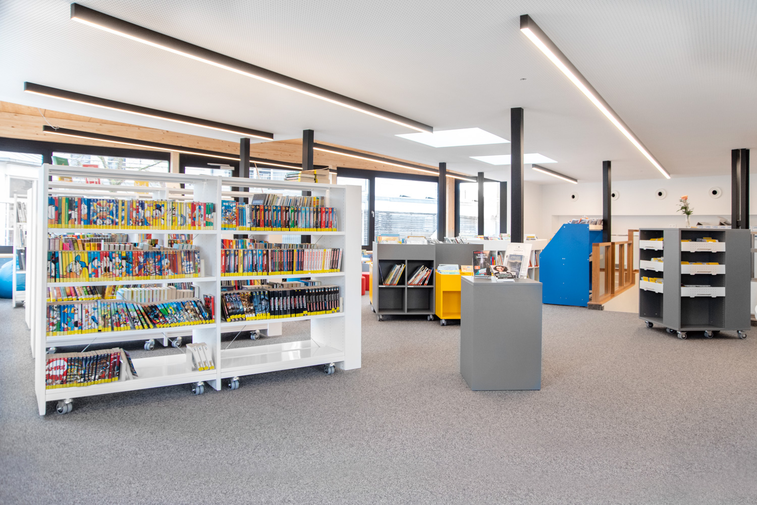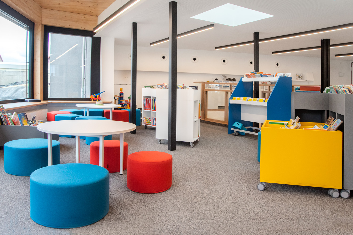 La répartition des espaces a été le plus grand défi, mais nous avons réussi à obtenir un bon résultat permettant d'accueillir tous types de public à l'intérieur sans que la bibliothèque ne semble trop exiguë ou saturée. Désormais, les habitants de Rot an See se retrouvent dans un environnement moderne et accueillant où ils peuvent trouver tout ce dont ils ont besoin.