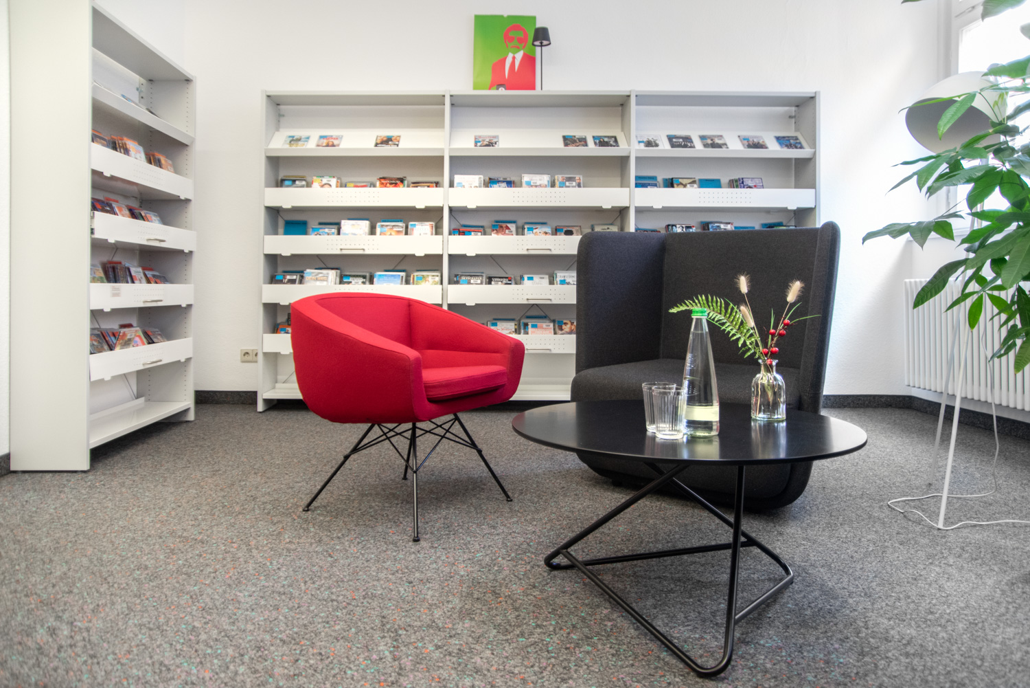 Les livres et autres documents sont présentés de manière agréable. Le mobilier offre à la bibliothèque une modularité et une polyvalence suffisantes pour répondre à tous les besoins.