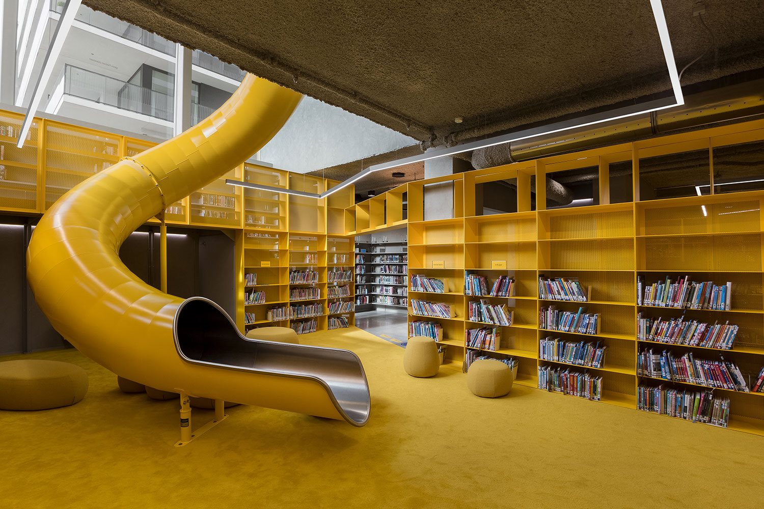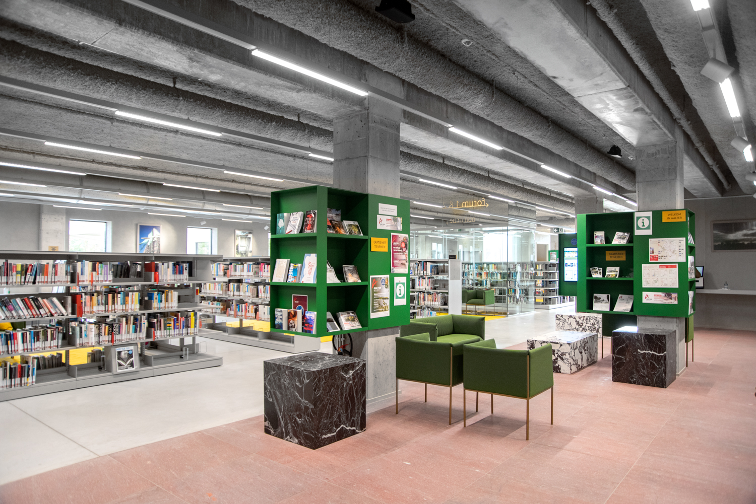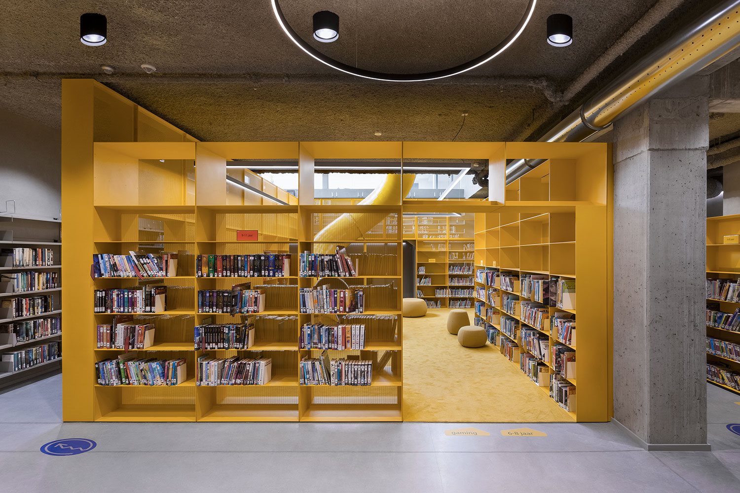 Cela se reflète dans de nombreux domaines: la bibliothèque est ouverte 12 heures par jour, la section jeunesse est accessible via un toboggan depuis le hall d'entrée, les étagères sont délibérément basses et entrecoupées de coins salons confortables et de longues tablettes de travail.