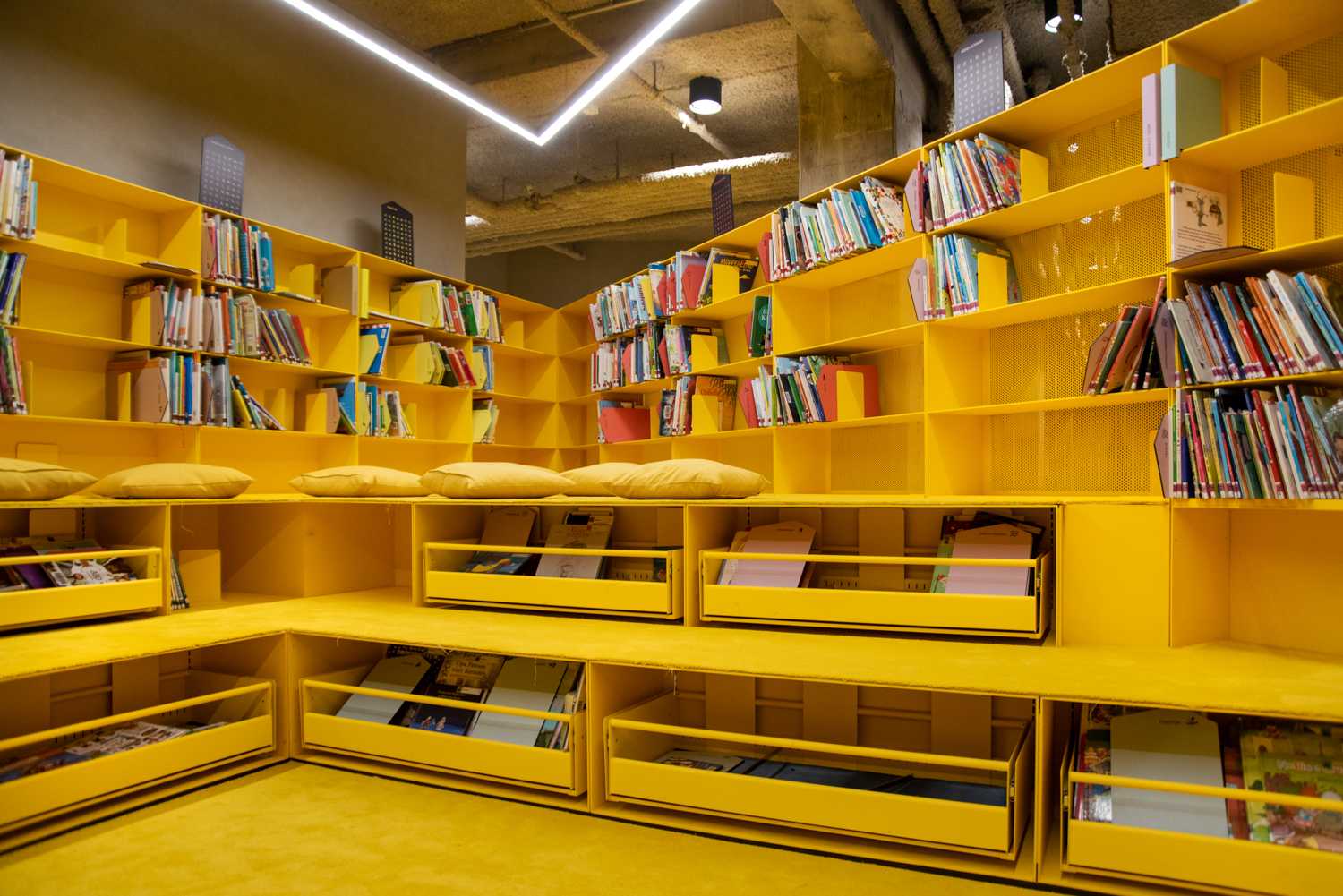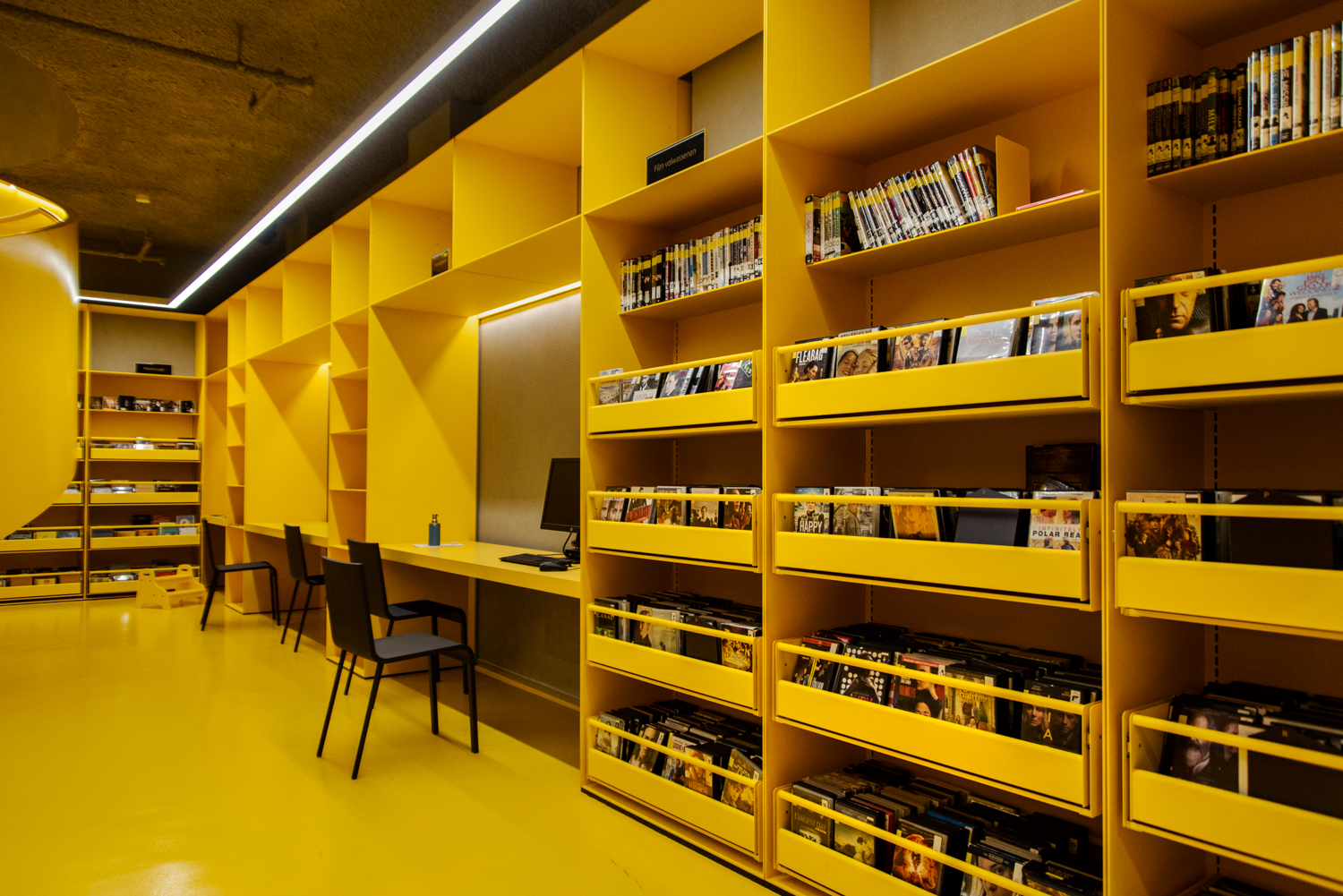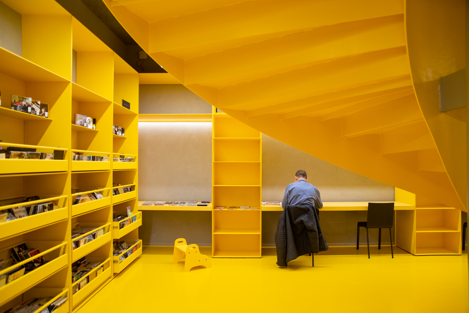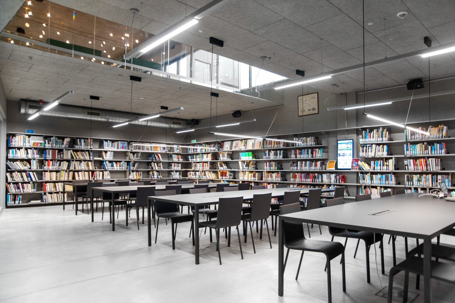 Cela se reflète dans de nombreux domaines: la bibliothèque est ouverte 12 heures par jour, la section jeunesse est accessible via un toboggan depuis le hall d'entrée, les étagères sont délibérément basses et entrecoupées de coins salons confortables et de longues tablettes de travail.