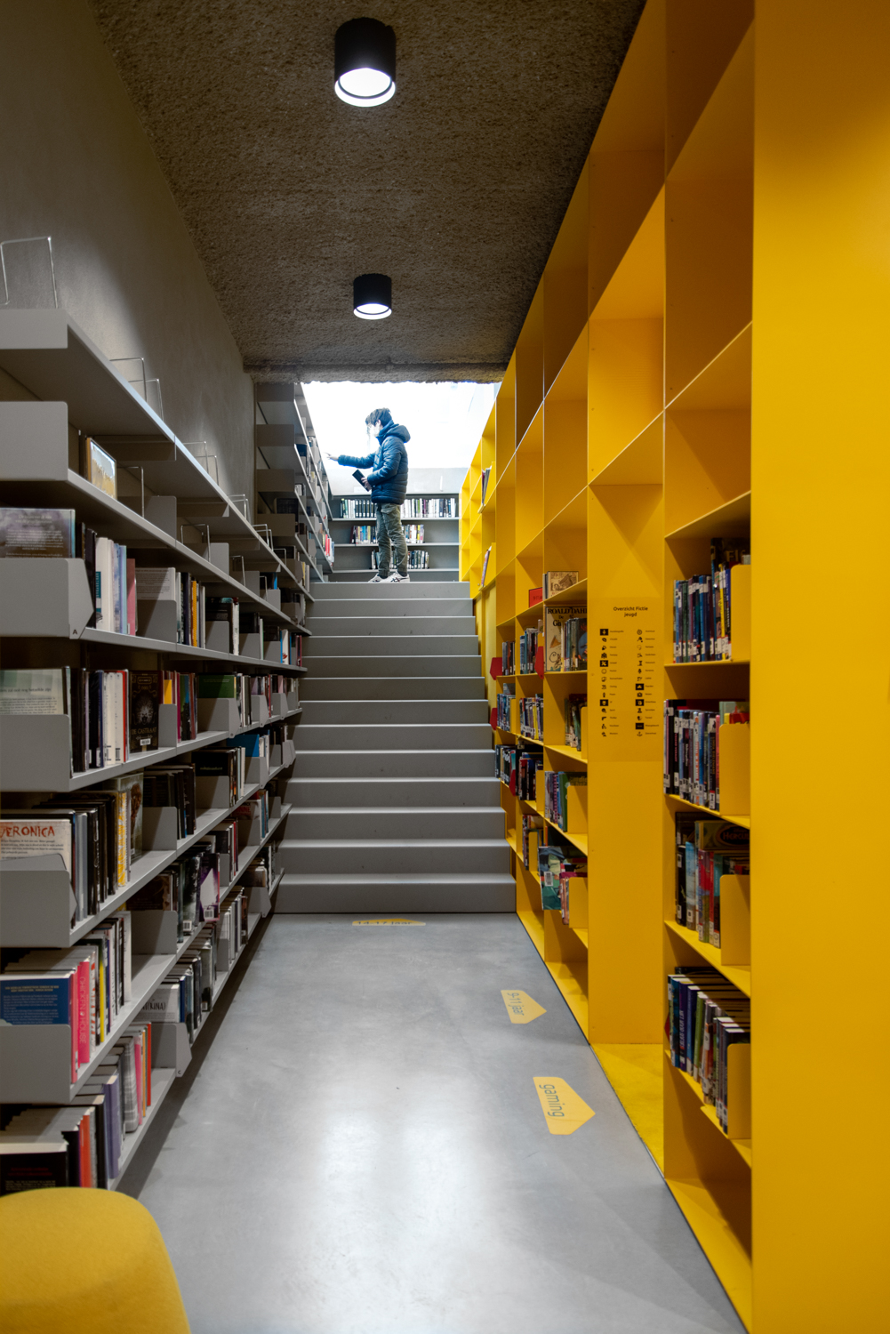 Un centre d'arts avec bibliothèque, académie et point culturel: BASIL Architecture a mis en œuvre ce programme au sein du bâtiment coque acheté par la municipalité. «La connexion est au cœur de tout », déclarent Lorenzo Deceuninck et Robin Van Beveren. "De chaque étage, vous avez une vue sur un étage supérieur ou inférieur quelque part, ce qui éveille votre curiosité. Quiconque traverse le bâtiment voit et ressent ce qui se passe autour."