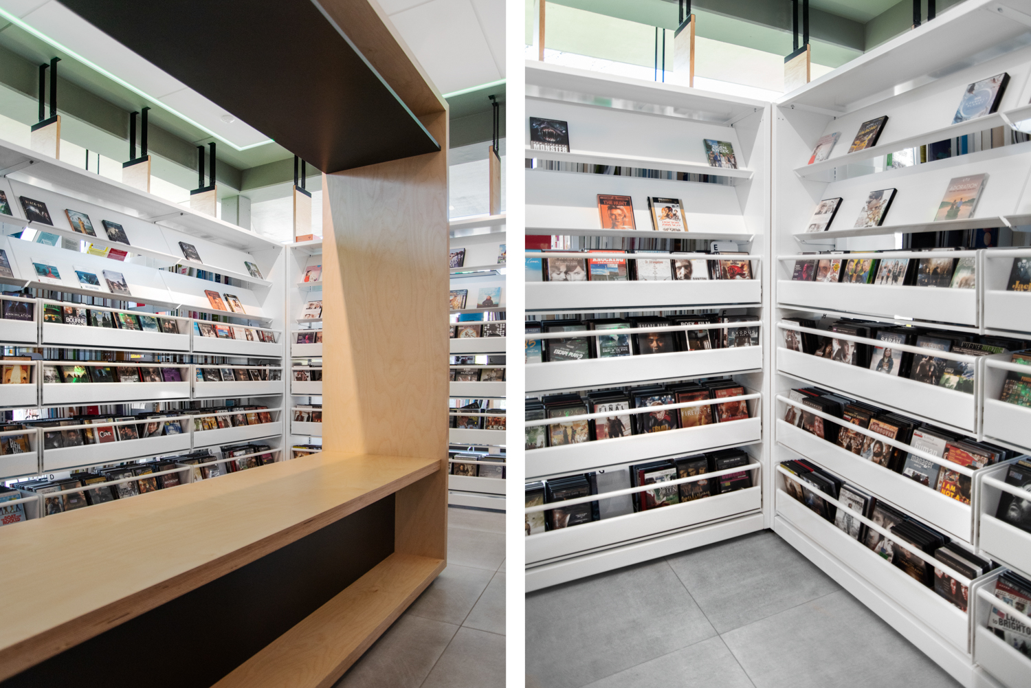 Autres détails : Un espace important est prévu pour la présentation des nouveautés et des stands thématiques, et une signalisation appropriée montre au visiteur le chemin à travers cette bibliothèque lumineuse.
