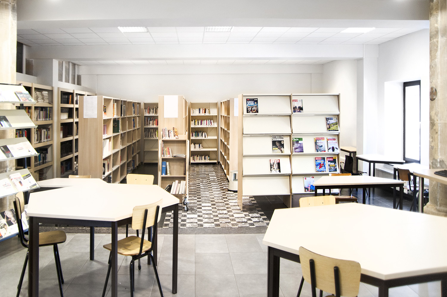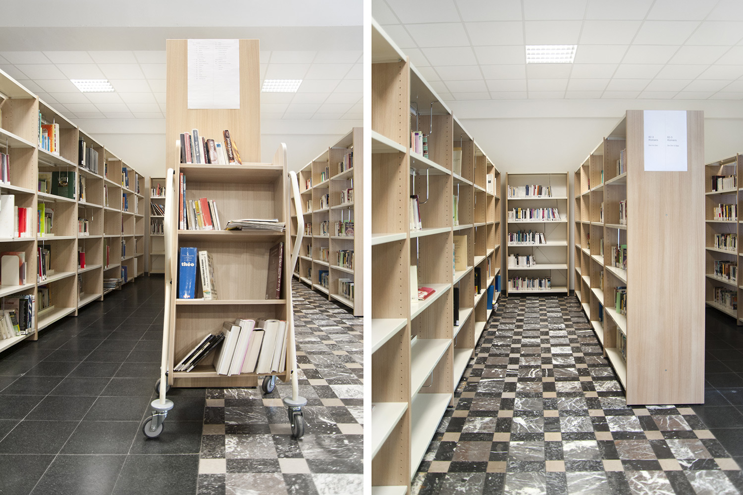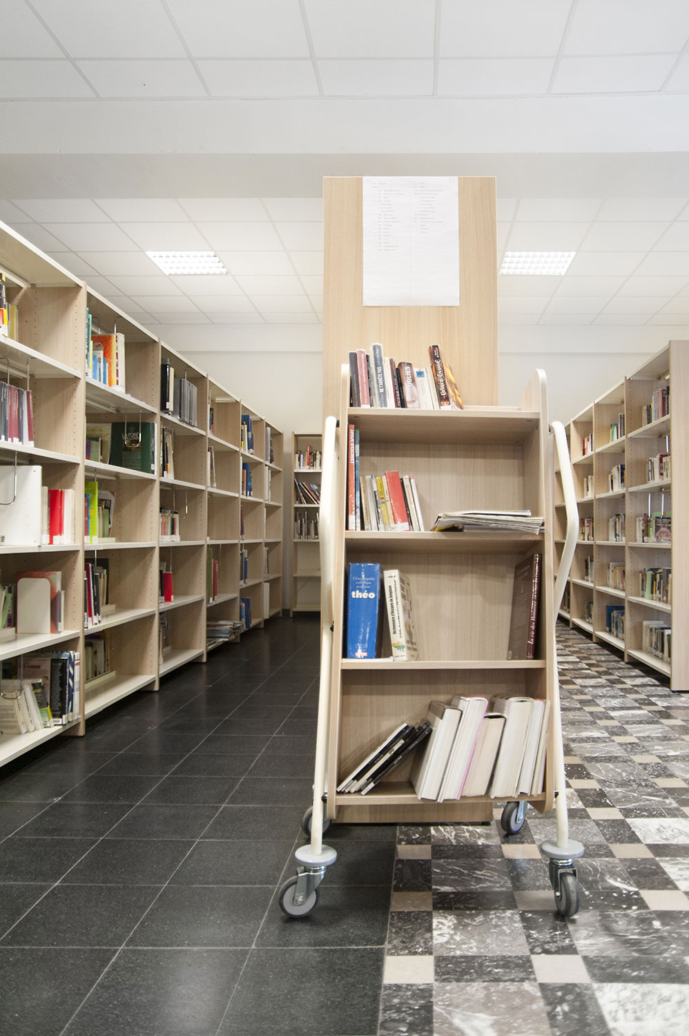 En 2010, la bibliothèque a déménagé dans une ancienne chapelle, mais le contraste entre le nouvel environnement et le mobilier vétuste était très marqué, tant au niveau pratique qu’esthétique. Deux exigences ont dû être prises en compte lors de la rénovation de l’intérieur : le cadre et le mode d’utilisation de la bibliothèque. Puisqu’elle se trouve dans une ancienne chapelle, il était très important de préserver les éléments architecturaux. Il était aussi essentiel que l’espace puisse faire office de salle de classe, parce que les professeurs enseignent parfois dans la bibliothèque pour que les étudiants puissent y chercher de la documentation.